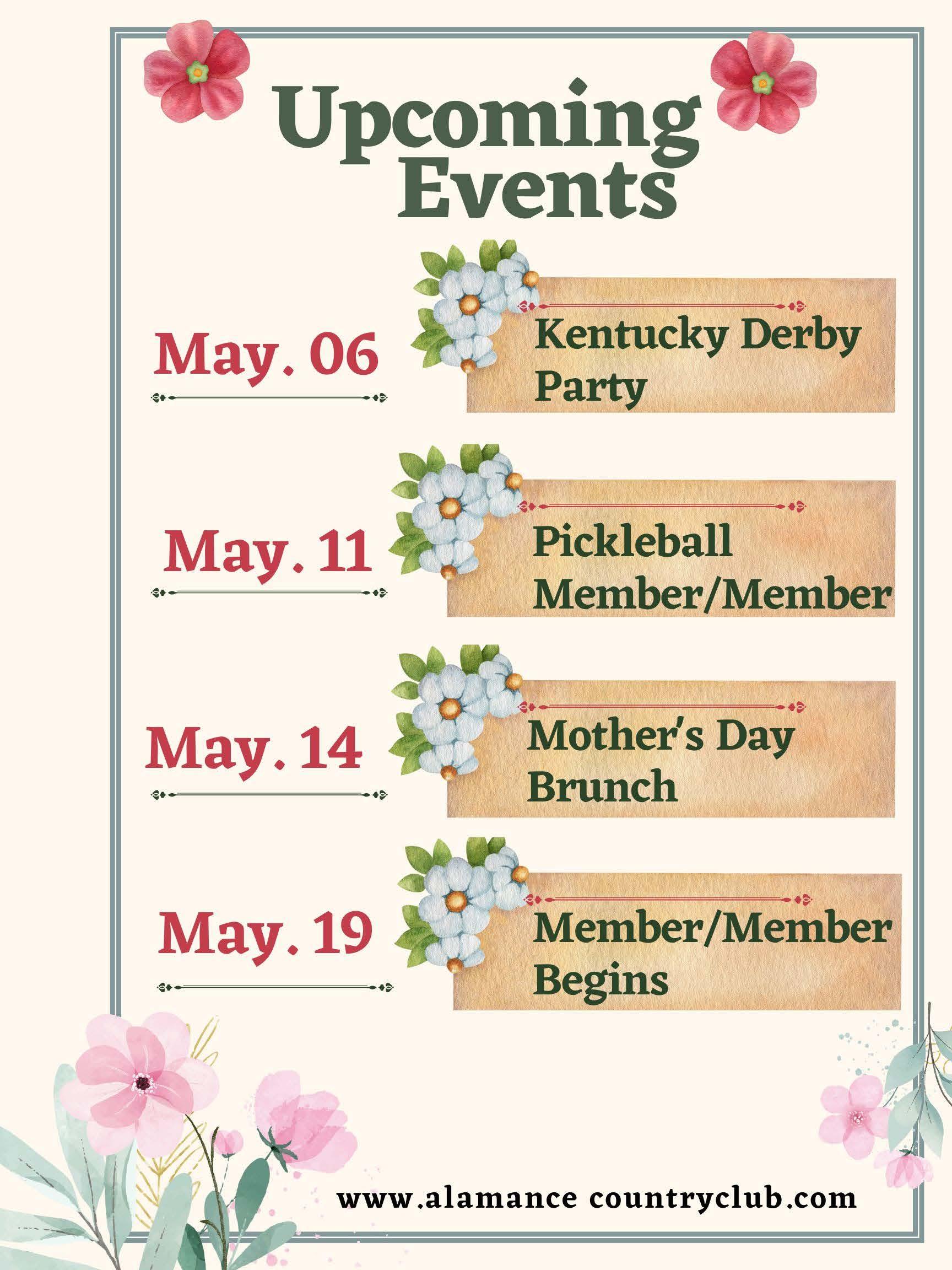 Racquet Sports Clinic Information | Contact Scott to sign up | sschofer@alamancecc.net | 3365844115 Scott Schofer,PTR, PPR Director of Racquet Sports sschofer@alamancecc.net Stefan Sumner, PTR, PPR Racquet Sports Professional ssumner@alamancecc.net Pro Shop Hours: Monday‐Thursday 9‐6 Frriday and Saturday 10‐4 Sunday 12‐4 remember to use your club app to reserve a court. also, all visitors must sign- in. 123456 78910111213 14 Mother's Day 15 16 17 18 19 20 21 22 23 24 25 26 27 29 Memorial Day 30 31 Pickleball Tournament ADV Pickle Match 6:30p Pickleball Tournament Mens / Womens Doubles 3.0 USTA - 9:30a PZ Clinic 4:00-5:30 RS meeting - 12:00 3.0 Clinic 10:00a Pairings Party - 6:00p Ladies Tennis 9:00a PZ Clinic 4:00-5:30 ATW 9:00a-10:30a ATW 6:00p PZ Clinic 4:00-5:30 New 2 Pickle 6:00p Ladies Tennis 9:00a Jr. QS 4:00-5:00p PZ Clinic 4:00-5:30 3.5 Clinic 9:00a Pickleball Tournament Mixed Doubles ATW 9:00a-10:30a 3.25 Ladder 10:00a 3.0 Clinic 10:00a 3.0 USTA - 9:00a (LJ) PZ Clinic 4:00-5:30 3.0 Ladder 1:00p 3.0 Clinic 9:00a ATW 6:00p ATW 9:00a-10:30a ADV Pickle Match 6:30p Thursday Saturday Friday Jr. QS 4:00-5:00p 3.5 Clinic 9:00a New 2 Pickle 6:00p Ladies Tennis 9:00a 3.5 Ladder 1:00p Jr. QS 4:00-5:00p ATW 6:00p