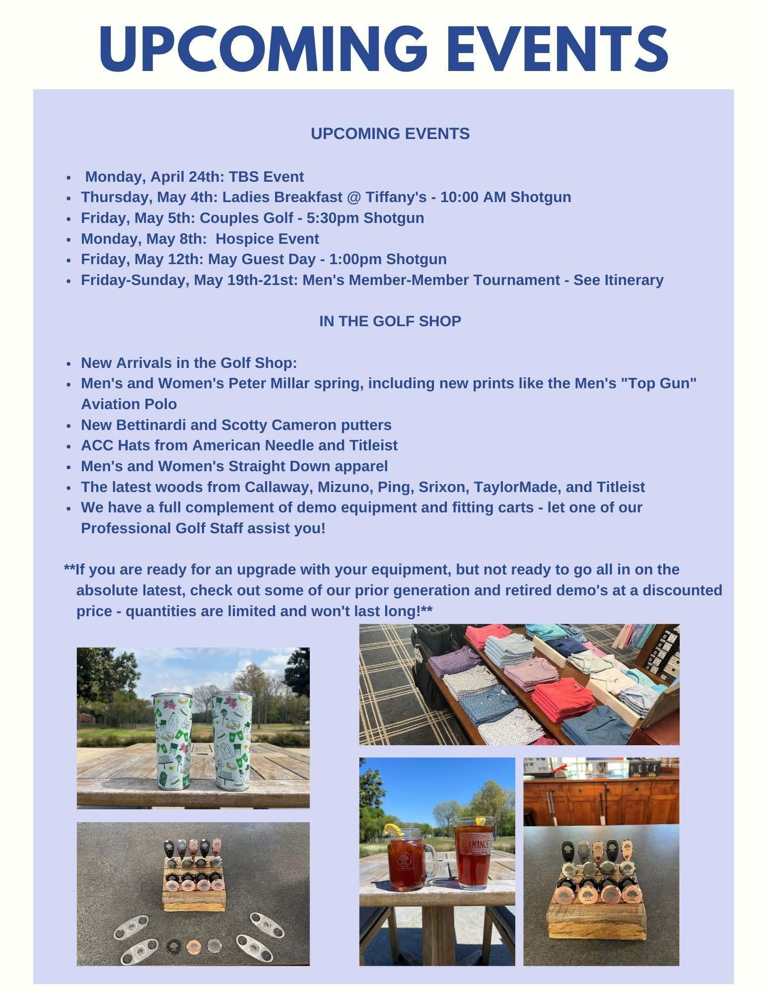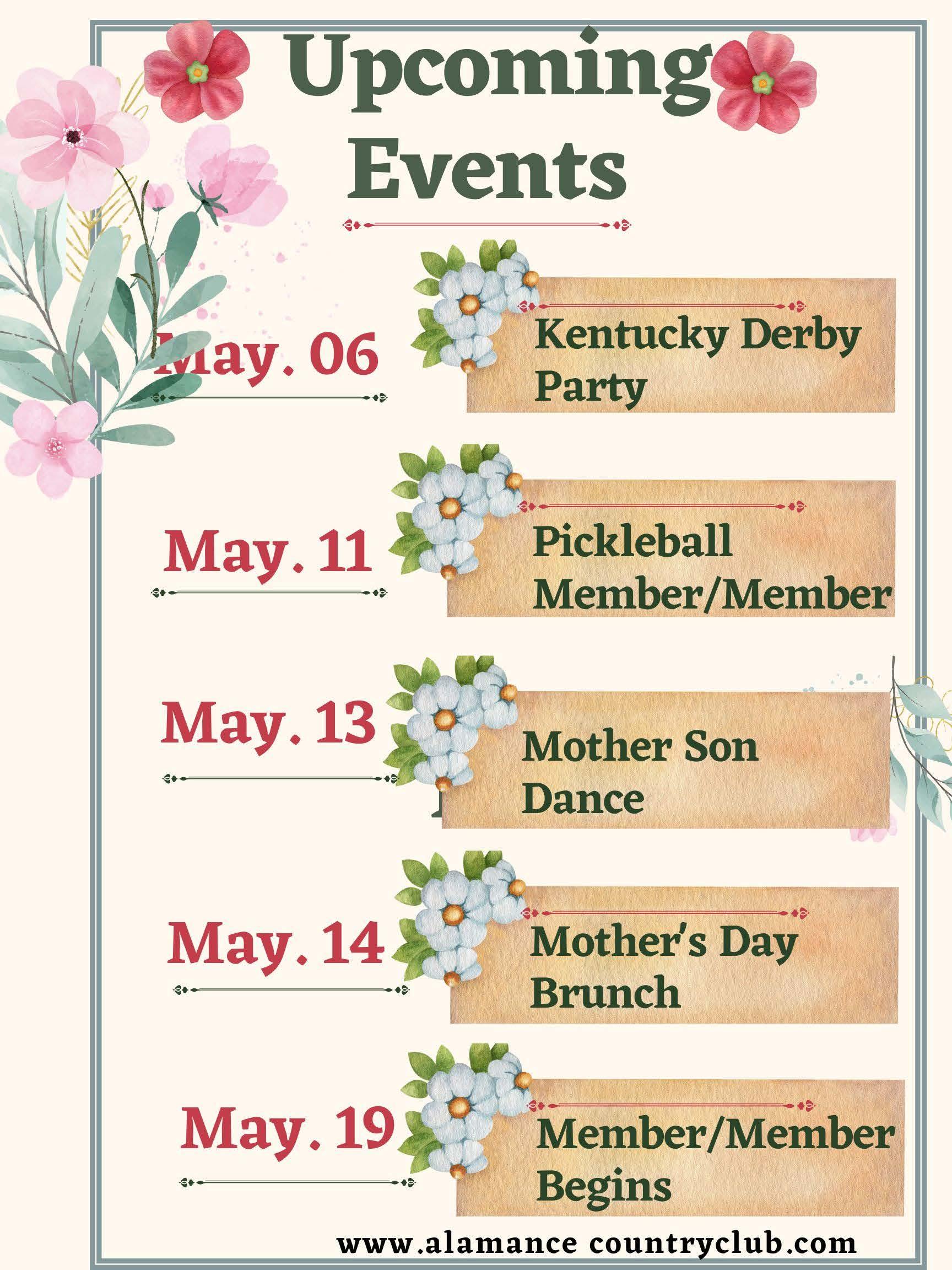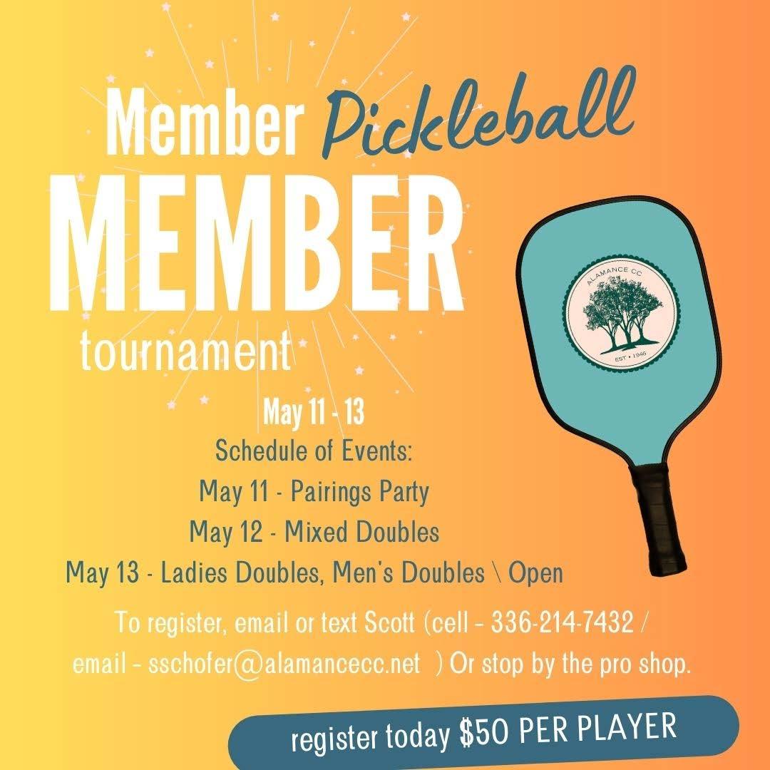 Racquet Sports Clinic Information | Contact Scott to sign up | sschofer@alamancecc.net | 3365844115 Scott Schofer,PTR, PPR Director of Racquet Sports sschofer@alamancecc.net Stefan Sumner, PTR, PPR Racquet Sports Professional ssumner@alamancecc.net Pro Shop Hours: Monday‐Thursday 9‐6 Frriday and Saturday 10‐4 Sunday 12‐4 remember to use your club app to reserve a court. also, all visitors must sign- in. 123456 78910111213 14 Mother's Day 15 16 17 18 19 20 21 22 23 24 25 26 27 29 Memorial Day 30 31 Pickleball Tournament ADV Pickle Match 6:30p Pickleball Tournament Mens / Womens Doubles 3.0 USTA - 9:30a PZ Clinic 4:00-5:30 RS meeting - 12:00 3.0 Clinic 10:00a Pairings Party - 6:00p Ladies Tennis 9:00a PZ Clinic 4:00-5:30 ATW 9:00a-10:30a ATW 6:00p PZ Clinic 4:00-5:30 New 2 Pickle 6:00p Ladies Tennis 9:00a Jr. QS 4:00-5:00p PZ Clinic 4:00-5:30 3.5 Clinic 9:00a Pickleball Tournament Mixed Doubles ATW 9:00a-10:30a 3.25 Ladder 10:00a 3.0 Clinic 10:00a 3.0 USTA - 9:00a (LJ) PZ Clinic 4:00-5:30 3.0 Ladder 1:00p 3.0 Clinic 9:00a ATW 6:00p ATW 9:00a-10:30a ADV Pickle Match 6:30p Thursday Saturday Friday Jr. QS 4:00-5:00p 3.5 Clinic 9:00a New 2 Pickle 6:00p Ladies Tennis 9:00a 3.5 Ladder 1:00p Jr. QS 4:00-5:00p ATW 6:00p