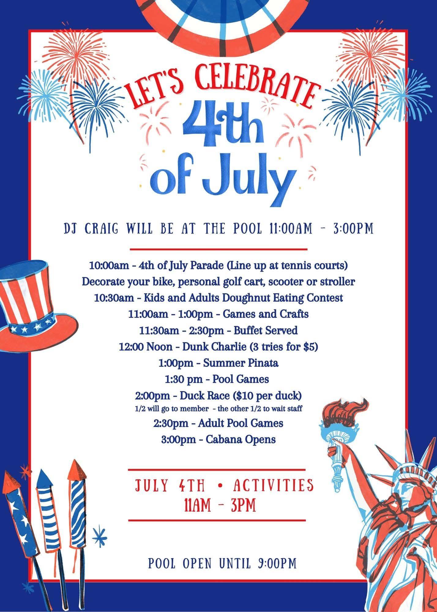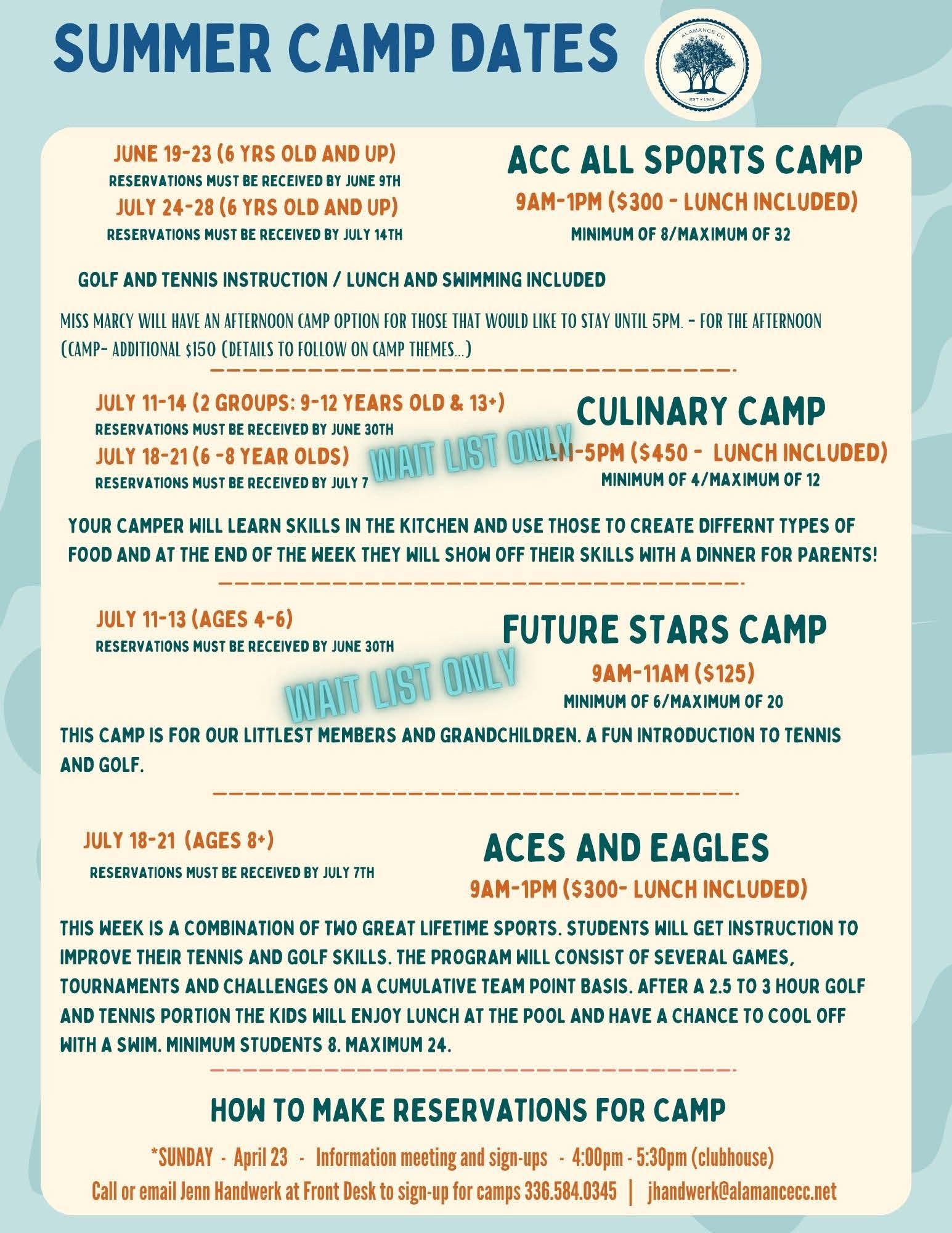 Clinic Information | Contact Scott to sign up | sschofer@alamancecc.net | 3365844115 Scott Schofer,PTR, PPR Director of Racquet Sports sschofer@alamancecc.net Stefan Sumner, PTR, PPR Racquet Sports Professional ssumner@alamancecc.net Pro Shop Hours: Monday‐Thursday 9‐6 Frriday and Saturday 10‐4 Sunday 12‐4 234 Independence Day 5678 9101112131415 16171819202122 23242526272829 31 All Sports Camp 9a-12 Jr Team - 2:00 (ACC) Beginner Pickle 6:00p Jr Team practice 2p 3.0 Clinic 9:00a All Sports Camp 9a-12 Jr Team practice 2p Margartia MXD Doubles Tennis 6:30p Men's Pickleball 6:00p All Sports Camp 9a-12All Sports Camp 9a-12 Aces and Eagles 9:00a Beginner Pickle 6:00p Men's Pickleball 6:00p Jr Team practice 2p ATW 9:00a-10:30a Aces and Eagles 9:00a 3.5 Clinic 9:00a ATW 6:00p ATW 6:00p Jr Team practice 2p 3.0 Clinic 9:00a Ladies Tennis 9:00a Aces and Eagles 9:00a Friday Thursday ATW 6:00p Jr Team - 2:00 (ACC) Men's Night 6:30p Aces and Eagles 9:00a Saturday Future Stars 9:00a 3.0 Clinic 9:00a Men's Pickleball 6:00p ATW 9:00a-10:30a Ladies Tennis 9:00a