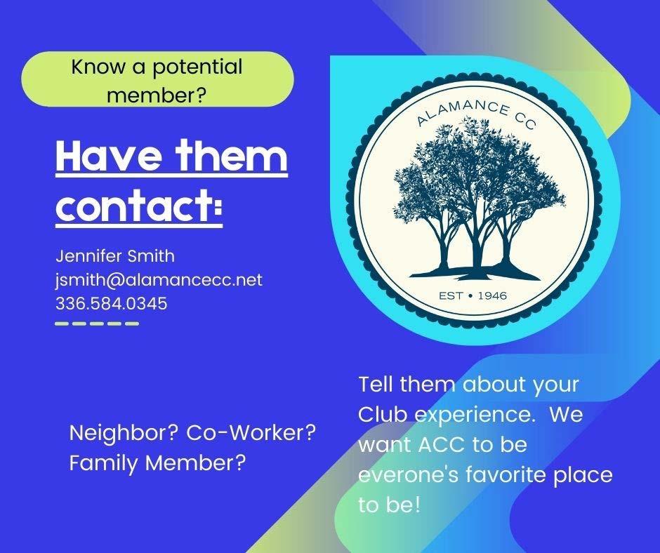 Additionally, we encourage you to find out about special occasions, such as birthday’s, weddings, new home, new baby, etc. and share this in formation with Jennifer Smith. She can get you something special to take to the new member to acknowledge the celebration on behalf of Alamance Country Club. It is also important to know of any bereavement/loss of the new member.