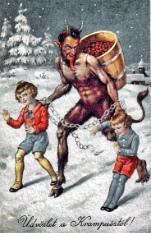 People dressed in devil costumes roam the streets, carrying chains and a basket for abducting especially bad children and hauling them to hell.