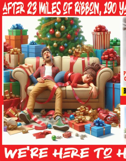 So here's to the tape, the ribbons so sly,Acomical Christmas, I can't deny.
