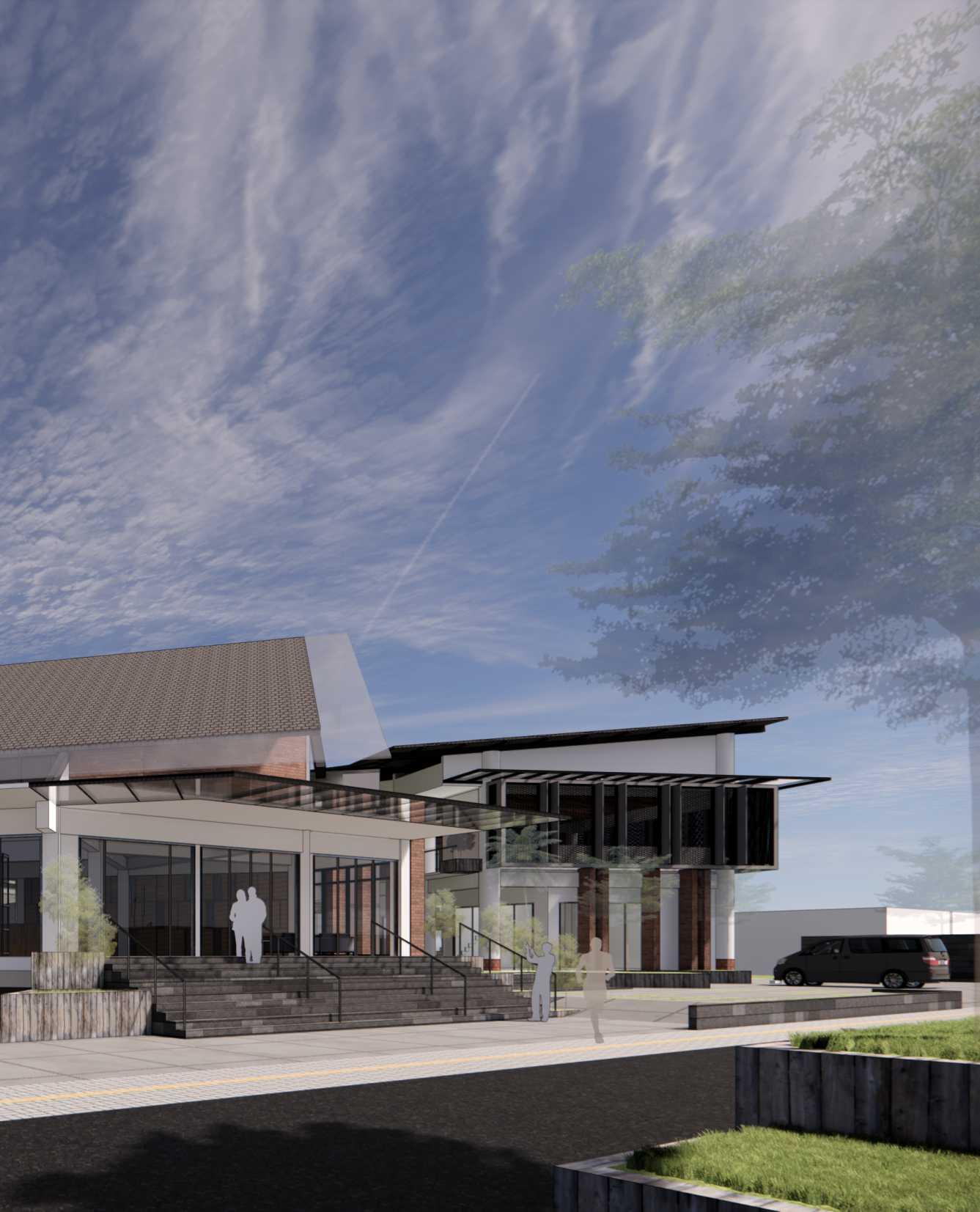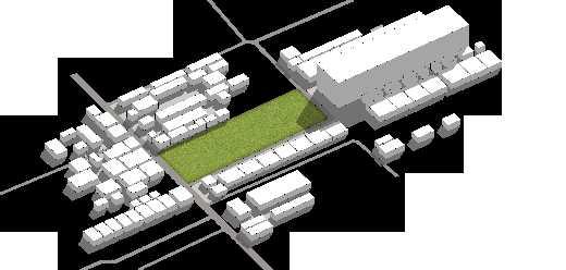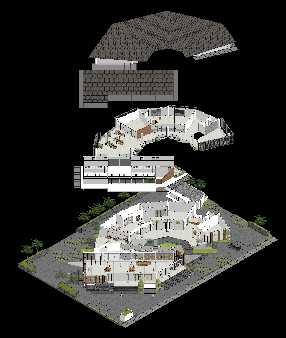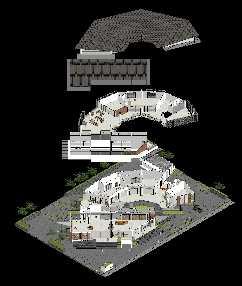 Membuat tiga bentukan massa yang merespon arah jalan, arah gerak matahari, dan b e n t u k l i n g k a ra n u n t u k menggambarkan kreativitas yang luwes dan tidak terkotakkotak