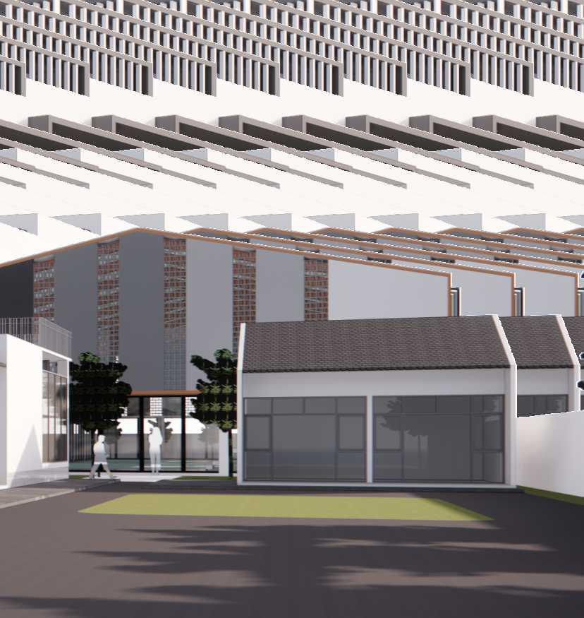Warung eksisting direlokasi menjadi bagian dari pasar, sementara bekas warung (bagian depan) dimanfaatkan menjadi gate, tempat parkir, dan shelter penyimpanan lapak temporer