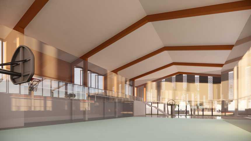 Tambahan massa melintang dari massa sebagai penyeimbang dan membuat ruang interaksi di tengah, dan sebagai shading ruang tersebut.