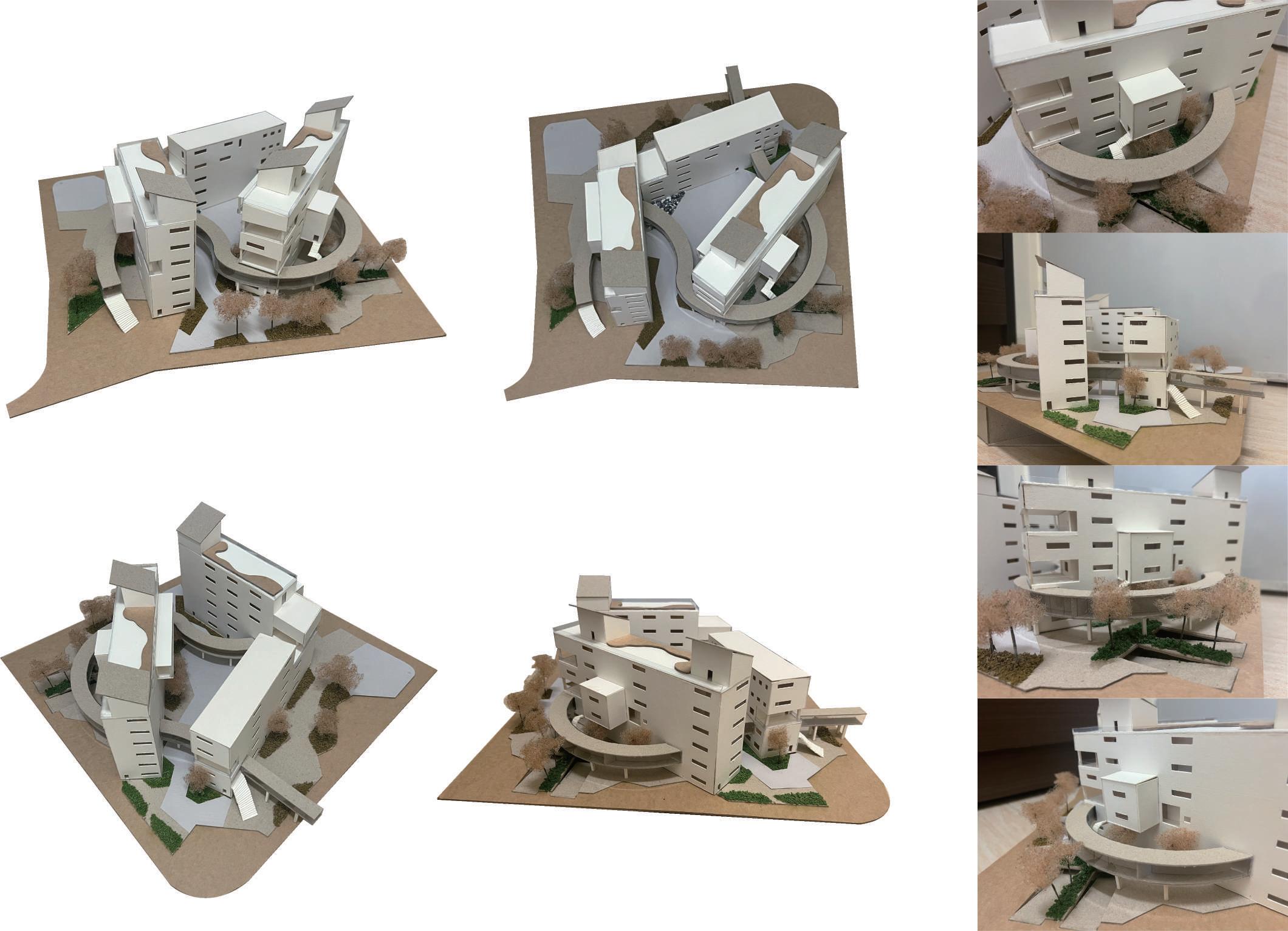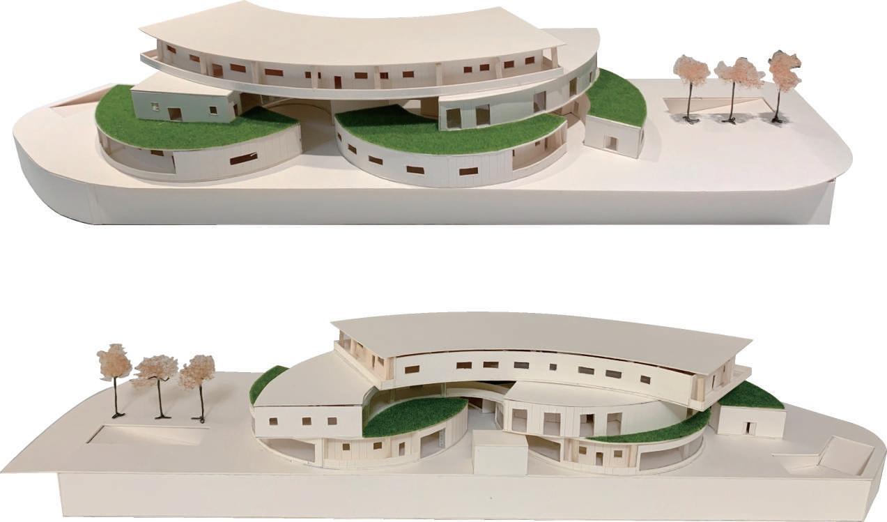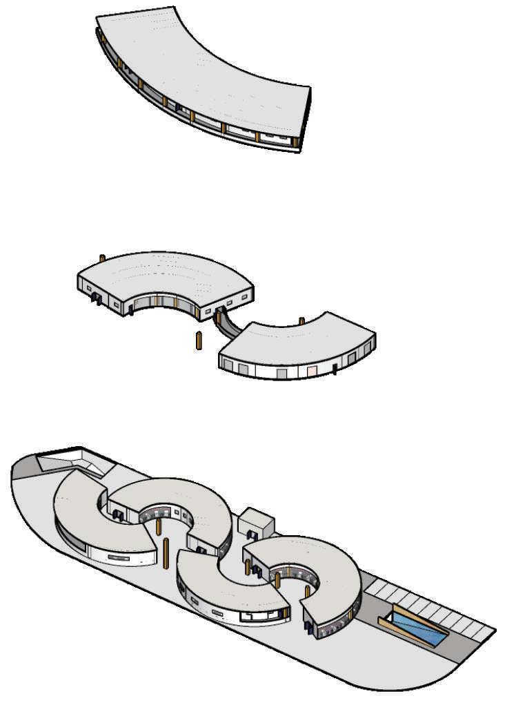 以左營果貿市場最知名特色-圓頂天,作為主要量體發展形式。 因果貿社區屬於內聚型的社區,圓頂天特色並不明顯,所以我將 市場以圓弧形量體去翻轉角度排列,凸顯本地特色。