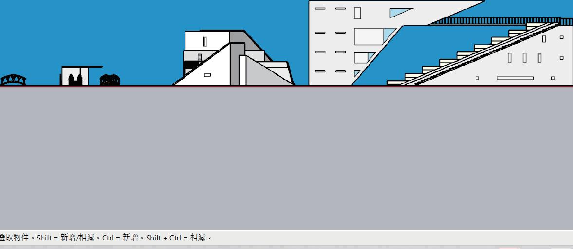 第一個圓表示我的模型取用了圓環以及圓弧的元素去貫穿 第二個源一方面希望這個市場源源不絕,一方面是希望人走 到這個市場兩層入口的時候,他們的視野差會由小而大,有如 進入了世外桃源一般。