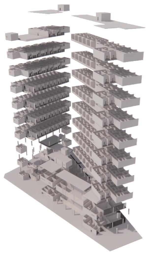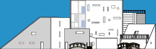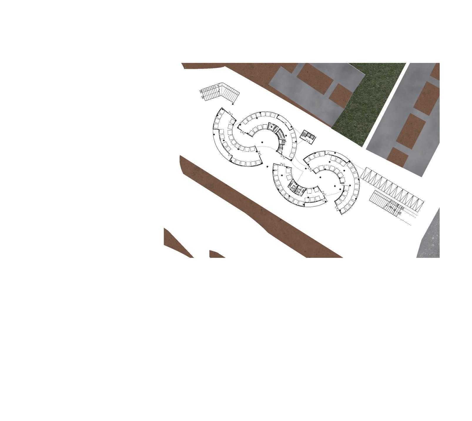 在”橋”內安排有趣空間,使人有欲望走進建築,而非直直走一樓 返家。有趣的空間如老人運動教室、課後輔導教室、學生安 親班,因對面為國小、國中,家長白天搭捷運往都市上班後,下班 可藉由連接捷運出口的通道進入橋內接小孩下課。老人運動 教室位在最靠近西南方區域,為了讓社區內的老人不必走得 太遠即可到達。