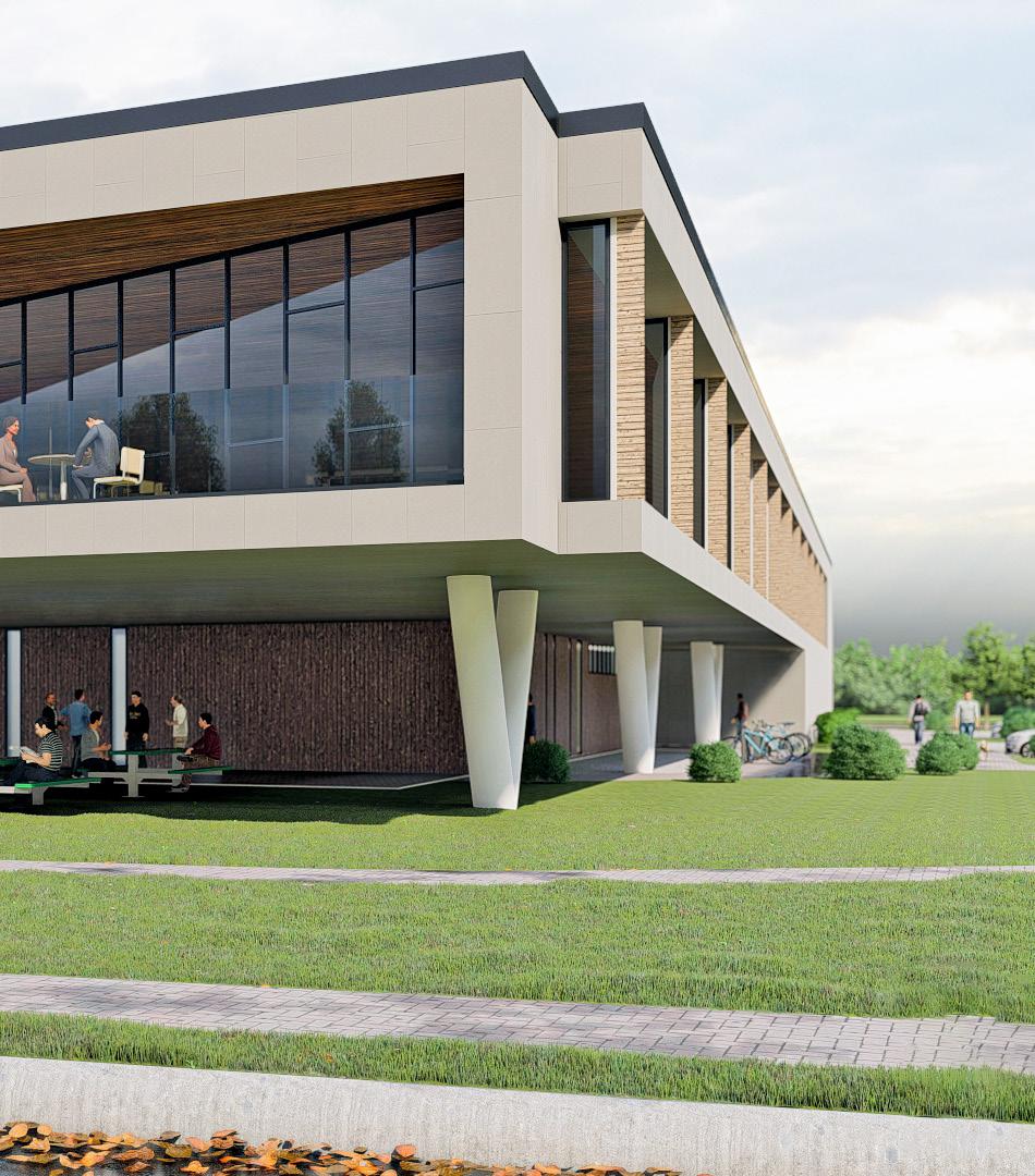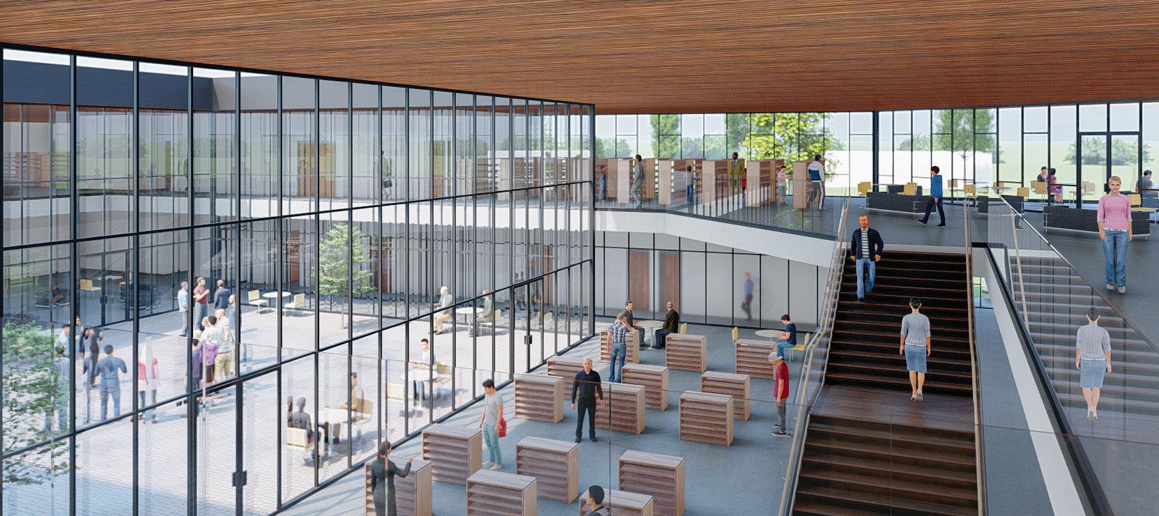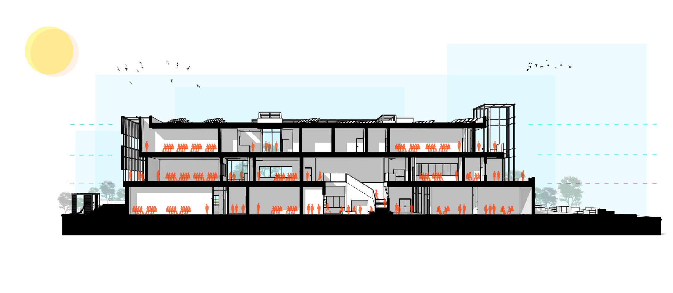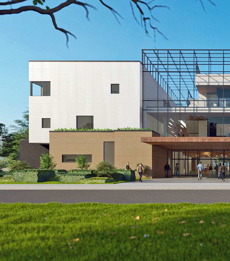 THE CONCEPT INTENDED WAS TO INVITE USERS BY DESIGNING A SPACE THAT INCORPORATES THE NATURAL ENVIRONMENT, AND ALLOWS PEOPLE TO INTERACT AS A COMMUNITY. THE LIBRARY IS COMPRISED OF TWO LEVELS, MAINLY SEPARATED BY BOOK COLLECTIONS AND COMMUNITY SPACES, AN INTERIOR COURTYARD, AND A PARK WITH OUTDOOR SEATING AND GATHERING SPACES. THE UPPER LEVEL OVERHANGS, CREATING COVERED SPACE UNDERNEATH FOR USERS TO GATHER AND ENJOY THE VIEW TO THE CONSTRUCTED BODY OF WATER. IN SCARCITY OF GREEN SPACES ON SITE, A RETENTION POND AND PARK WAS INTEGRATED TO THE LANDSCAPE DESIGN.