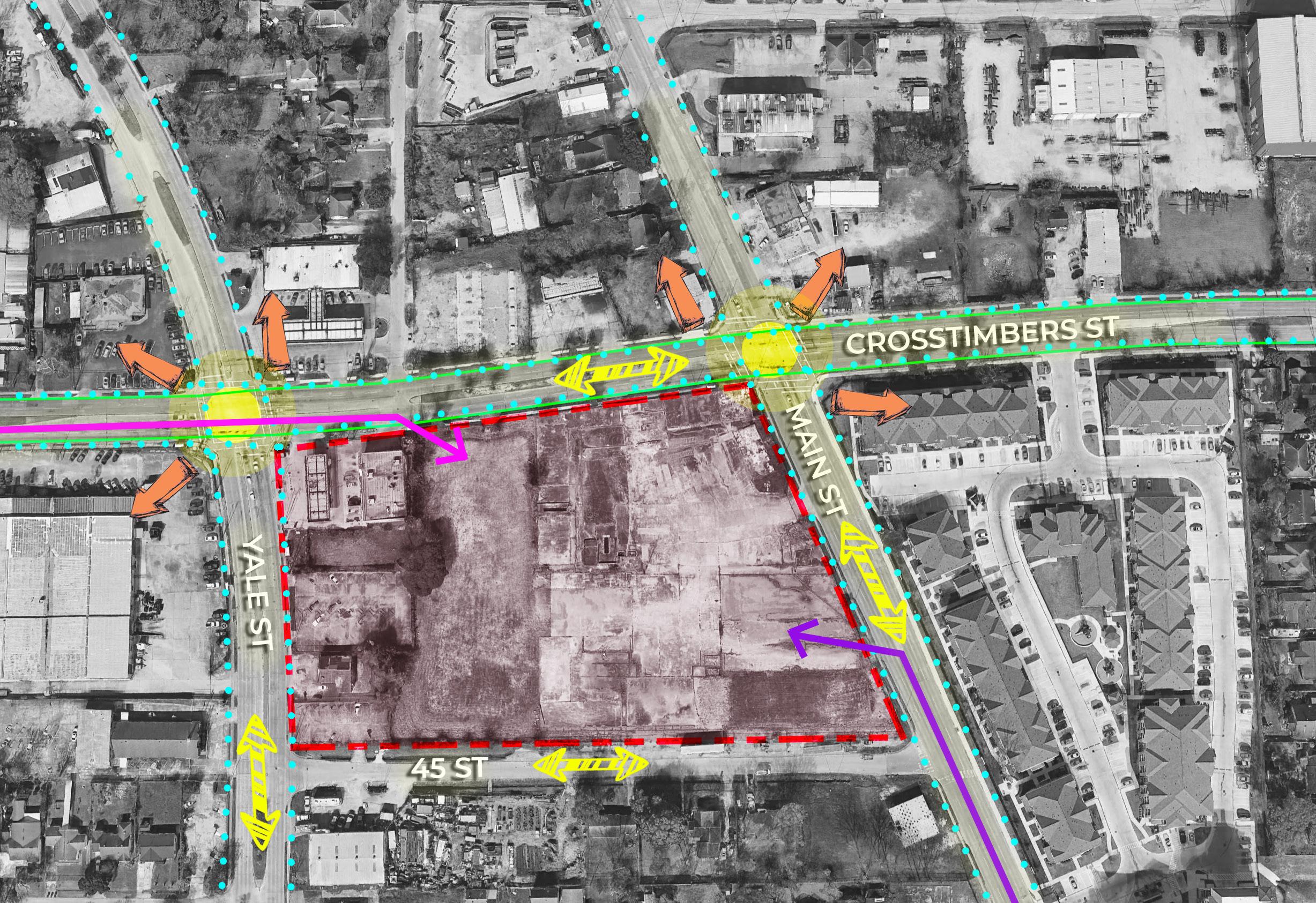 STRENGTHS: • Pedestrian + Vehicular Accesibility • Available Public Transportation Lack of Positive Views WEAKNESSES: Outdoor Recreation + Park Implementation OPPORTUNITIES: Flooding area at Crosstimbers St + Main St THREATS: