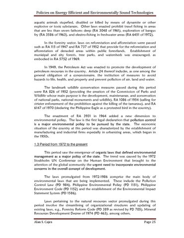 Policies on Energy Efficient and Environmentally Sound Technologies aquatic animals stupefied, disabled or killed by means of dynamite or other explosive or toxic substances. Other laws enacted prohibit trawl fishing in areas that are less than seven fathoms deep (RA 3048 of 1961), exploration of bangus fry (RA 3586 of 1963), and electro-fishing in freshwater areas (RA 6451 of 1972). In the forestry sector, laws on reforestation and afforestation were passed such as RA 115 of 1947 and RA 737 of 1952 that provide for the reforestation and afforestation of denuded areas within public forestlands. Establishment of municipal and city forests, tree parks, and watersheds was encouraged, as embodied in RA 5752 of 1969. In 1949, the Petroleum Act was enacted to promote the development of petroleum resources in the country. Article 24 thereof includes, as one among the general obligation of a concessionaire, the institution of measures to avoid hazards to life, health, and property and prevent pollution of air, land and water. The landmark wildlife conservation measures passed during this period were RA 826 of 1952 (providing the creation of the Commission of Parks and Wildlife whose main purpose is the development, maintenance, and conservation of national parks, national monuments and wildlife), RA 1086 of 1954 (calling for stricter enforcement of the prohibition against the killing of the tamaraw), and RA 6147 of 1970 (declaring the Philippine Eagle as a protected bird in the country). The enactment of RA 3931 in 1964 added a new dimension to environmental policy. The law is the first legal declaration that pollution control is a major environmental policy to be pursued by the state. The economic situation of the country at this period was characterized by the establishment of manufacturing and industrial firms especially in urbanizing areas, which began in the 1950s. 1.3 Period from 1972 to the present This period saw the emergence of organic laws that defined environmental management as a major policy of the state. The trend was caused by the 1972 Stockholm UN Conference on the Human Environment that brought to the attention of the global community the urgent need to incorporate environmental concerns in the overall concept of development. The laws promulgated from 1972-1986 comprise the main body of environmental laws that are being implemented. These include the Pollution Control Law (PD 984), Philippine Environmental Policy (PD 1151), Philippine Environment Code (PD 1152) and the establishment of the Environmental Impact Statement System (PD 1586). Laws pertaining to the natural resources sector promulgated during this period involve the streamlining of organizational structures and updating of existing laws, e.g., Forestry Reform Code (PD 389 as revised by PD 705), Mineral Resources Development Decree of 1974 (PD 463), among others. Alan S. Cajes
