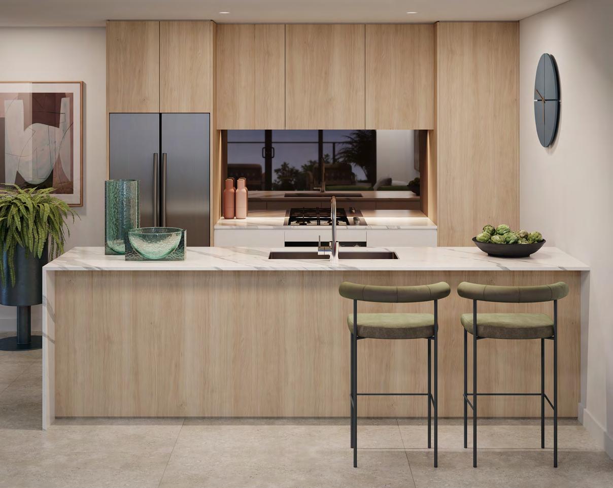 Designer GROHE tapware, glass splashbacks and ample storage offer the ease of space, while recessed downlights and underlit cabinetry create a classy ambience. As the heart of each home, the stylish kitchens at Quartz are a perfect marriage of form and function, designed for those who love to cook and entertain.