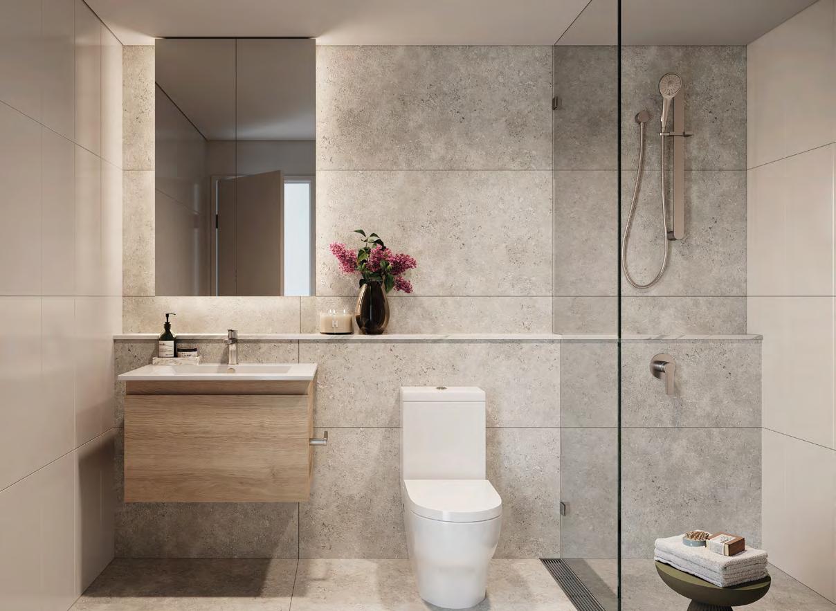 Contemporarily finished with porcelain tiles and built-in ventilation, the bathrooms exude a smart, modern feel. Timber joinery creates a sleek, luxurious look, while mirrored cabinets, designer GROHE tapware and premium lighting offer a beautiful sensory experience.