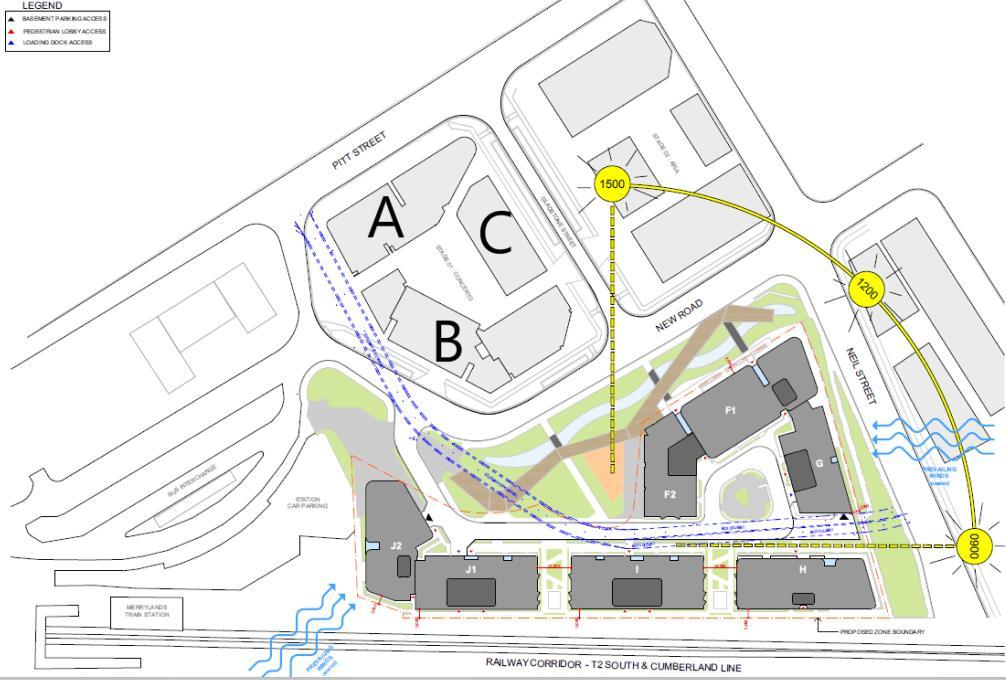 The draft plans for the mixed-use development comprise ten buildings surrounding a new central public park and civic space on the site. Two new roads linking Neil Street to Pitt Street will separate the buildings in Site A&B and Site C.