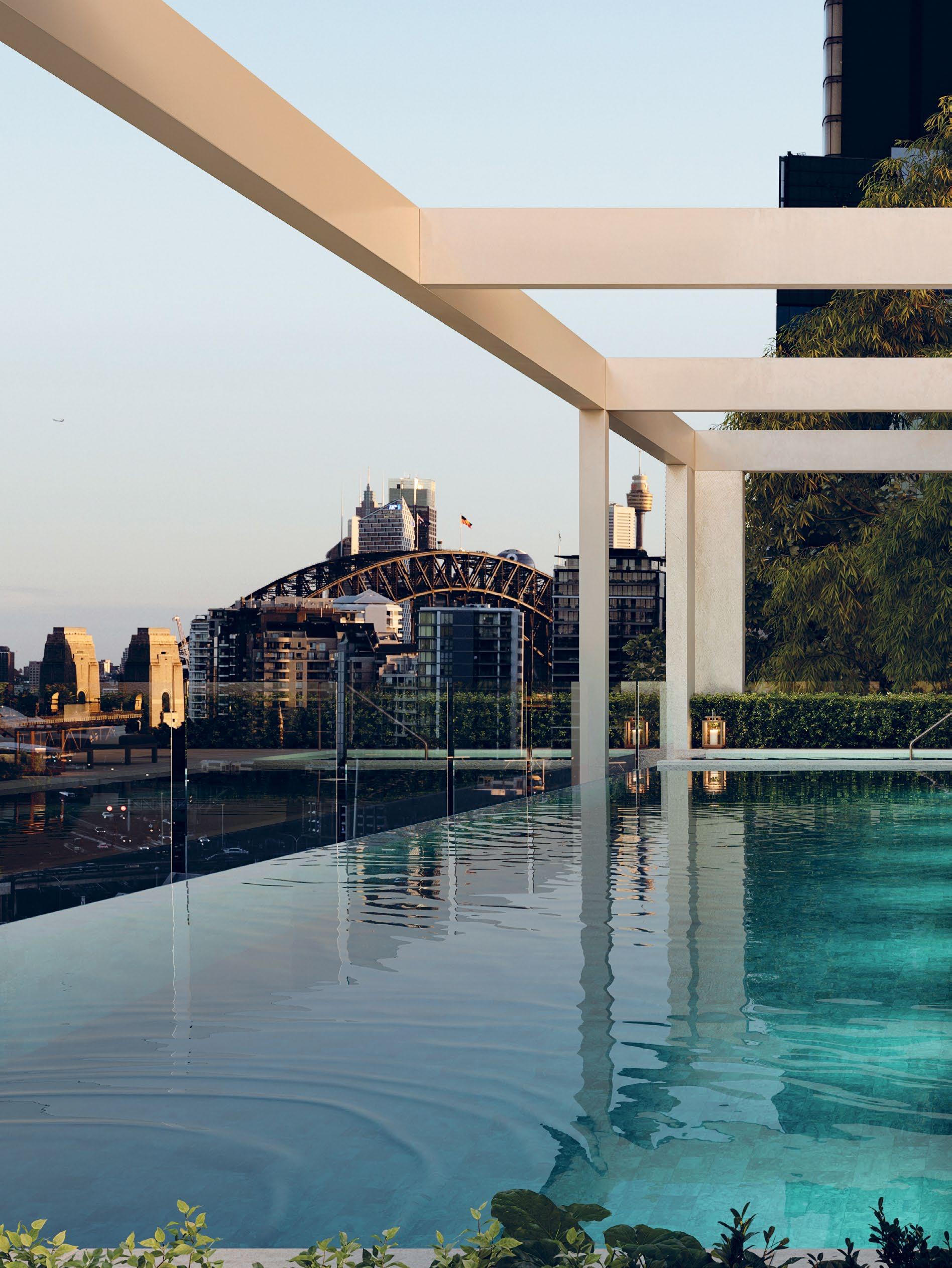 Cascading landscaped gardens evoke the natural canopies and gullies of Sydney's iconic bushland. High above, the alfresco dining area and cabana enjoy views across the harbour – an ever-changing backdrop of beauty from day to night.