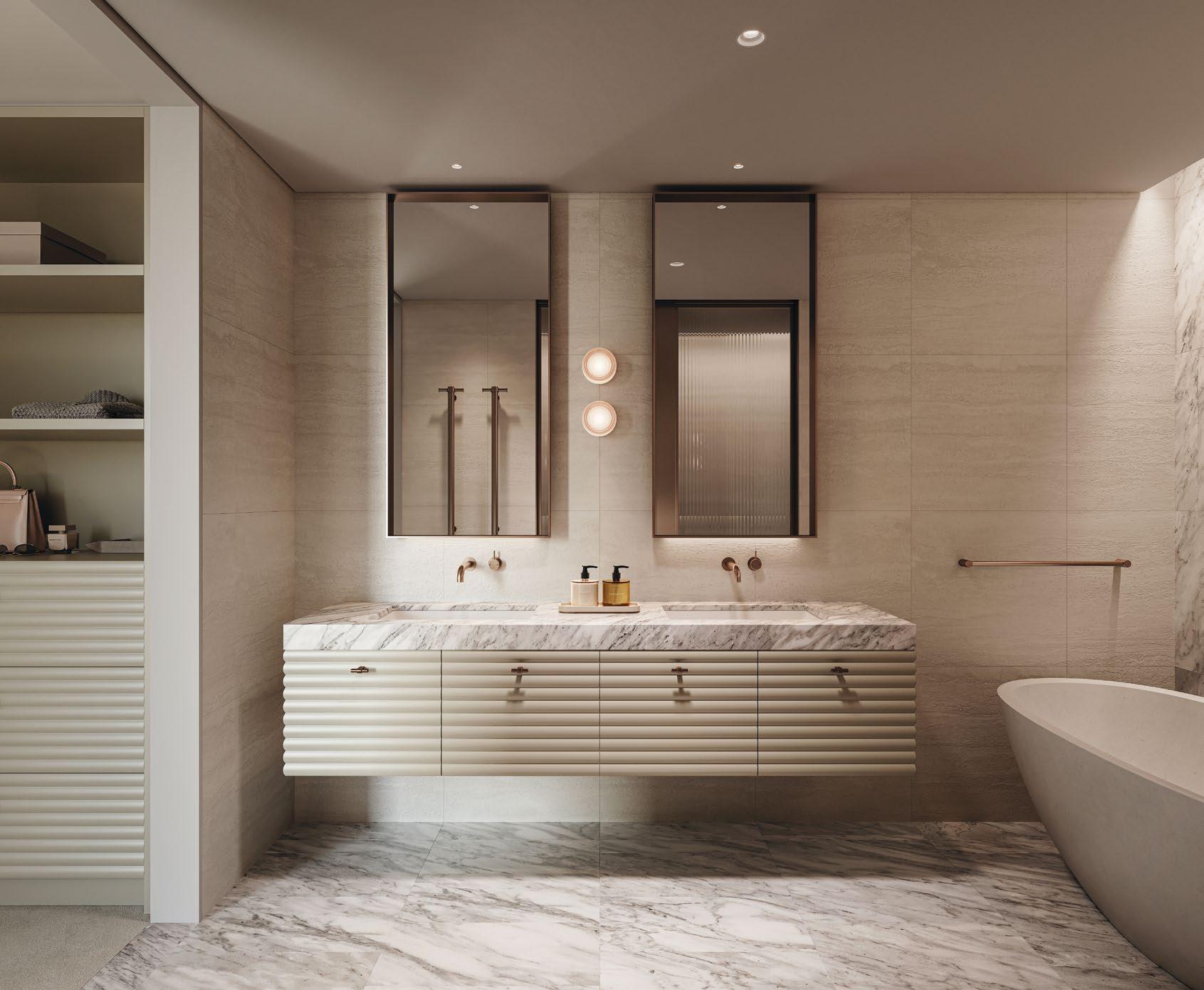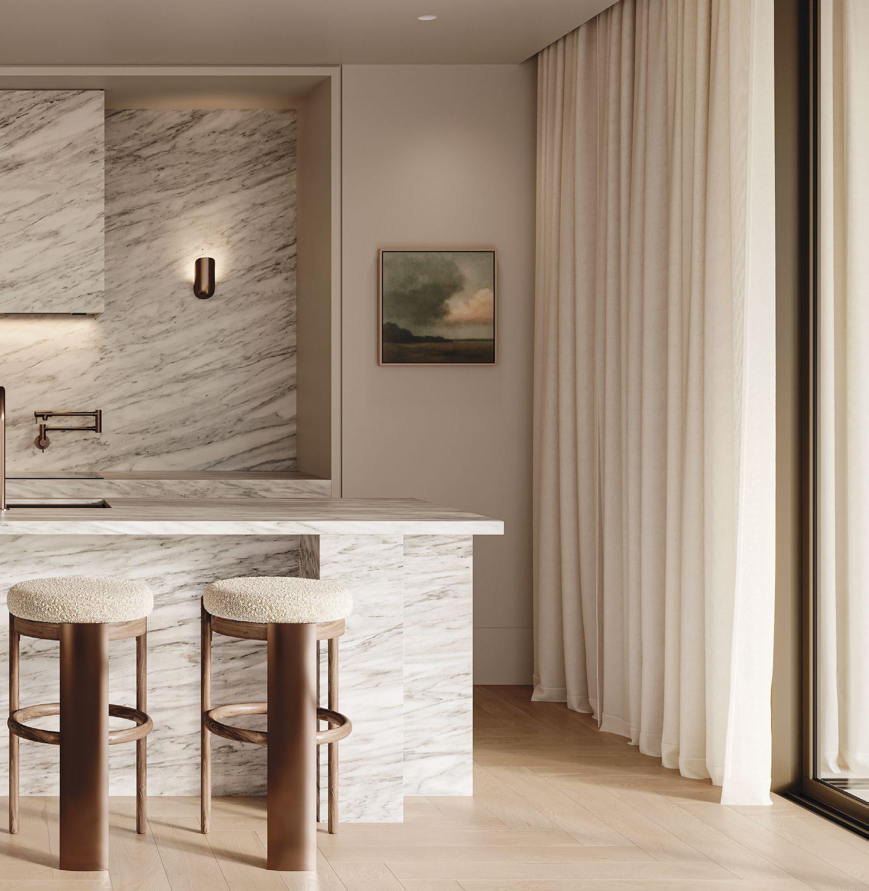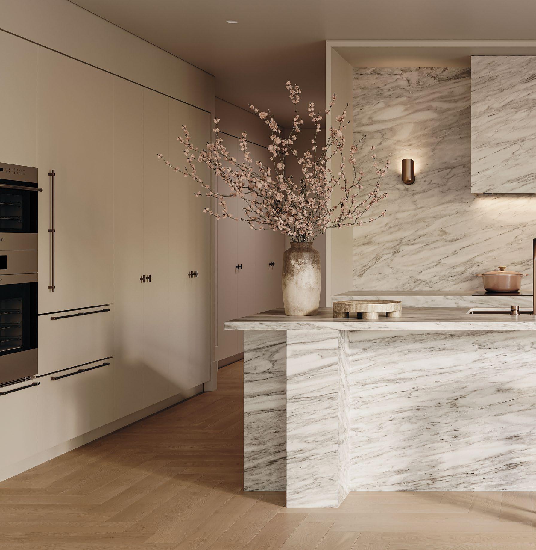 Natural beauty meets refined functionality in your meticulously crafted kitchen. Set within expansive house-sized apartments, the flowing kitchen spaces and thoughtfully designed layouts elevate daily living. Every element is chosen for its exceptional craftsmanship – from fully integrated appliances and Calacatta marble to sculptural sconces designed by local studio Henry Wilson.