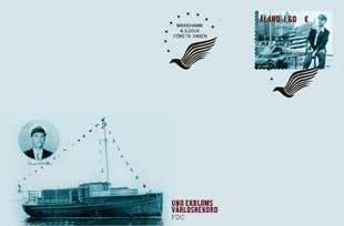 ON 3 MAY 1939, he set off on his Atlantic crossing from Åland via Stockholm and Gothenburg, where his Swedish crew of two came on board. The two proved to be an encumbrance more than a help; one of them was continually seasick and the other was a heavy smoker, using up all the matches meant to light the engine. Two months after departure, Uno reached New York, creating quite a stir on both sides of the Atlantic. Some of the newspaper articles adorn the centre of the stamp sheet.