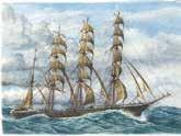 ONE OF THE LAST co-ownerships of Åland vessels emerged in 1931, when Åland captain Ruben de Cloux acquired the four-masted barque Parma from shipowner F. Laeisz of Hamburg. She was built in Glasgow in 1902 as Arrow. During her time under Åland flag, Parma was the world’s largest sailing cargo ship with a tonnage of over 5200 tons. The barque is famous for having made the fastest ever voyage in the 1900s’ wheat trade; in 1933, the passage to England took only 83 days with Captain de Cloux at the rudder, already then renowned for his fast sails. On the stamp, Allan has illus trated Parma on her record passage, sails unfurled and making 12-15 knots heading for the Cape Horn. The sailing era of the ship ended abruptly following an accident in Glasgow in 1936.