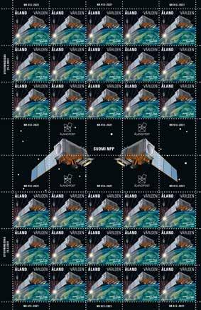 THE AMERICAN SUOMI NPP weather satellite on the stamp monitors the Earth’s cloud cover, oceans, ice sheets, vegetation and the heat radiation from the Earth’s atmosphere. Since 2011, this polar orbiting satellite passes above both poles on each revolution, several times each day. The Suomi NPP is one of several satellites pro viding data for weather forecasts in Finland.