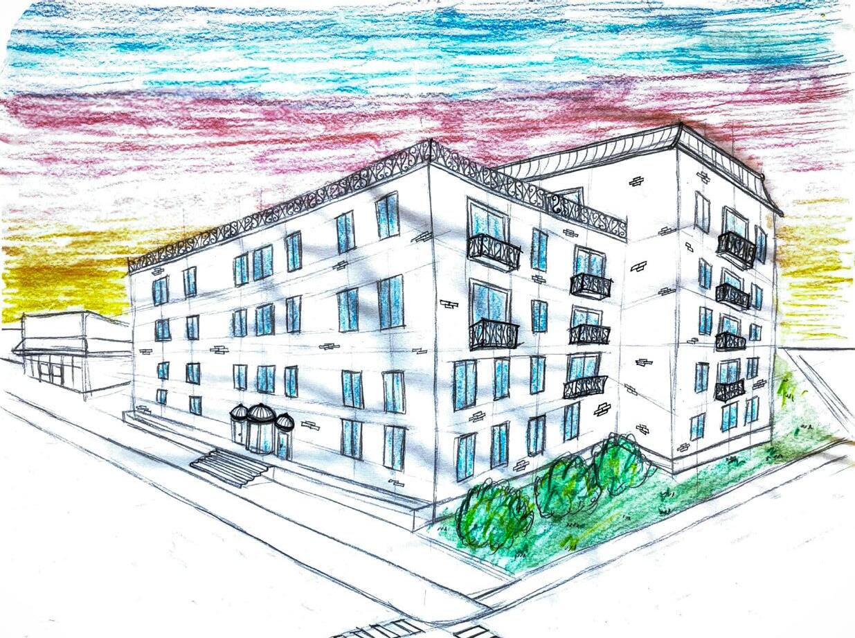 hand drawn and watercolor perspective of building exterior from street view
