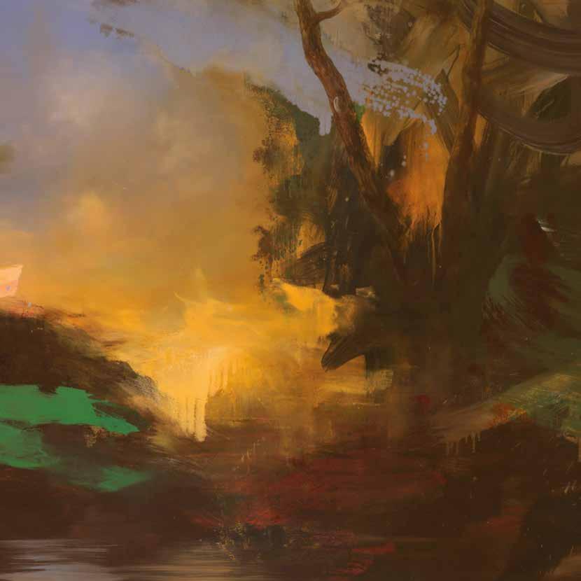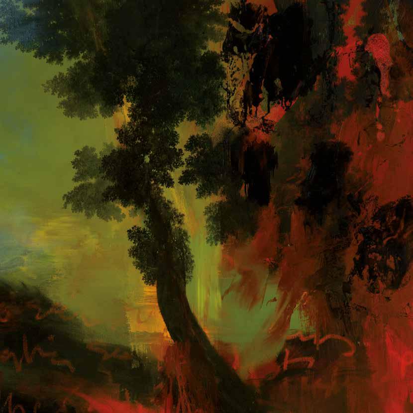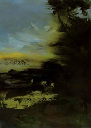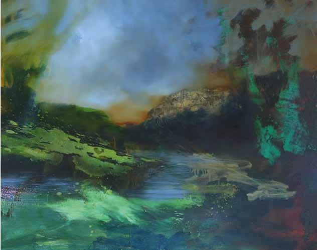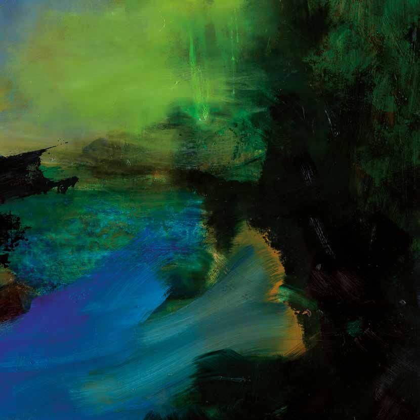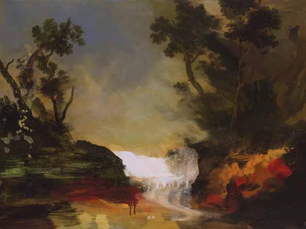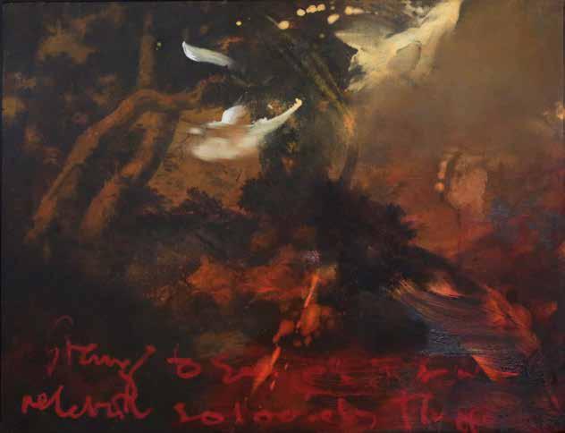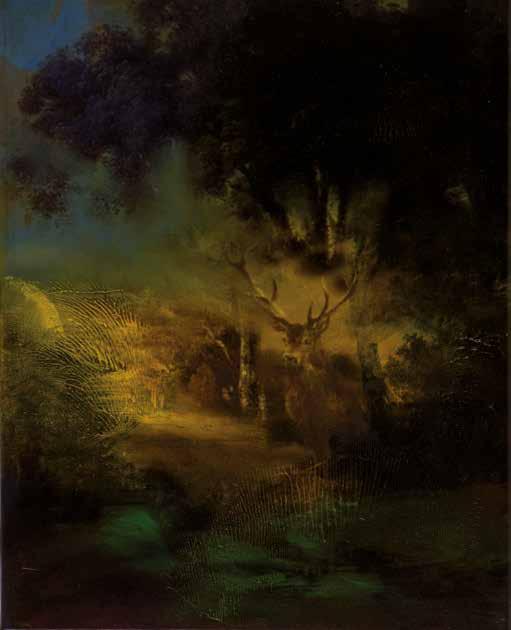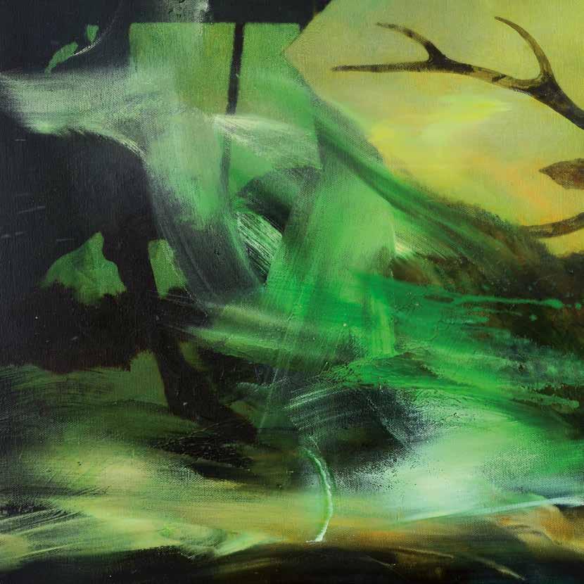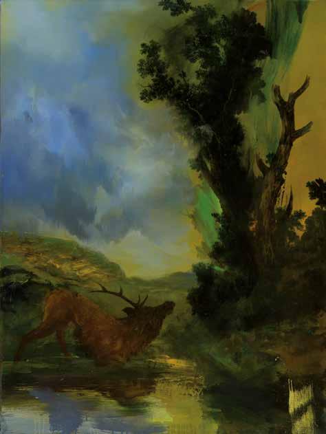 in the forest and in an instant it’s gone, like a phantom. My paintings are also about how images combine in the mind. I might be staring at the sea, but thinking about my mother. The physicality of paint embodies these ideas, painting can become an emblem of thought and memory as figurative elements disappear and reappear until they hold meaning. It’s one thing if the stag is running from a hunter, or a forest-fire or a loud noise, but now when nature itself is on the run, this is fear of another order, the stag is running, but the air and trees and snow are also running.’