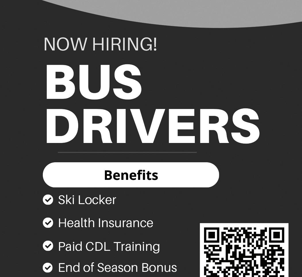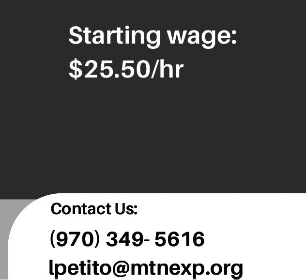 OUR TEAM: Mountain Express is looking to recruit already CDL’d drivers for immediately available shifts. Starting wage is $25.50/hr. as well as a sign-on bonus. Free health insurance is available based on hours worked. Ski locker benefit. Drivers are responsible for safe transport and friendly assistance of passengers on our bus route. Please contact Leah Petito at lpetito@ mtnexp.org to apply and for a complete Job Description visit mtnexp.org.