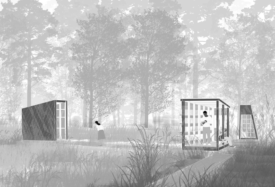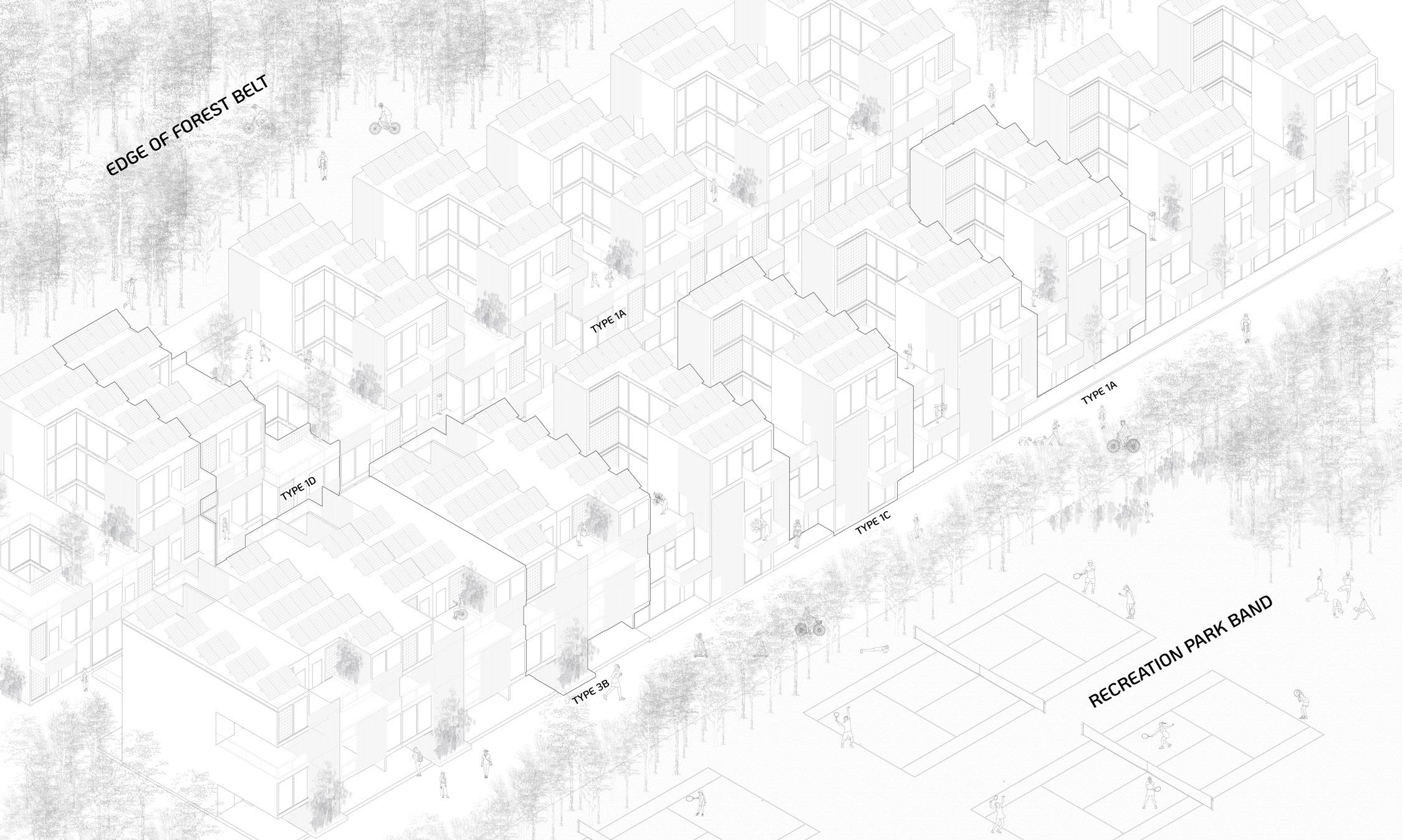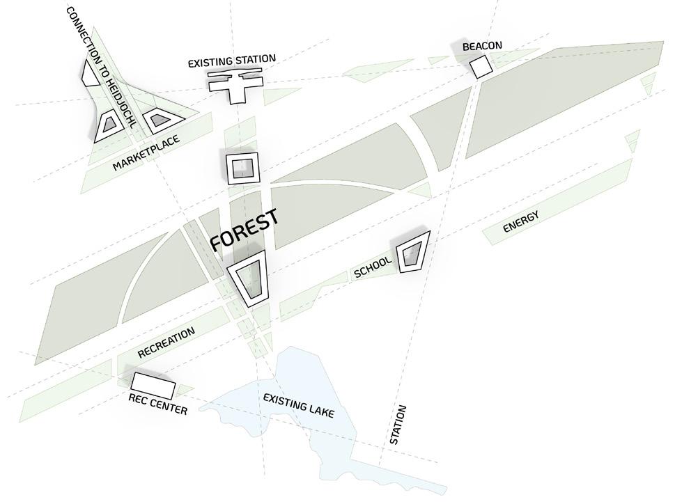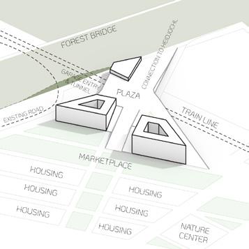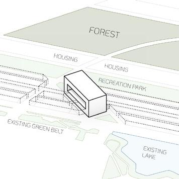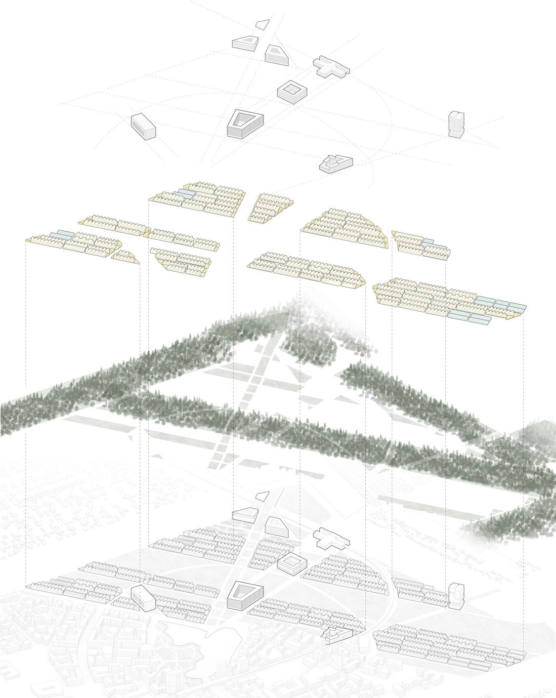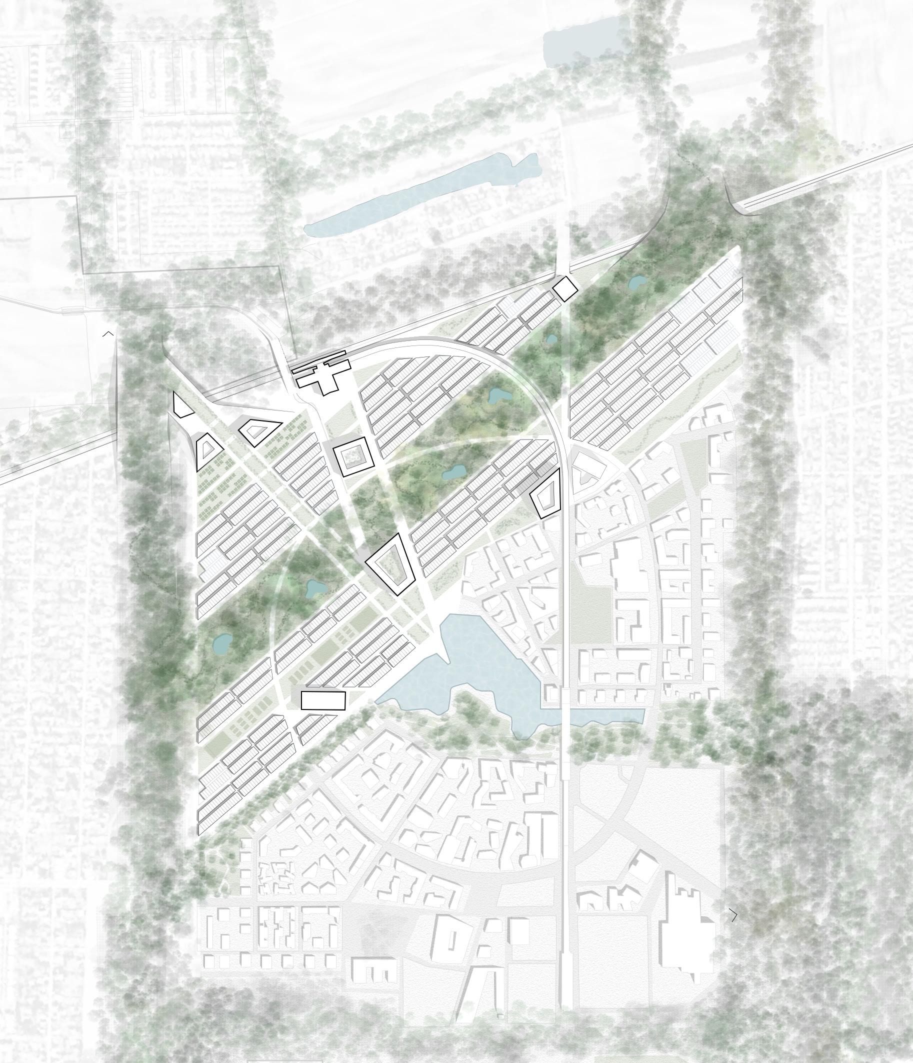 The overall urban strategy is driven by the creation of a forest belt to support nature-centered activities as well as an understanding of the urban grain from site-specific relationships and conditions.