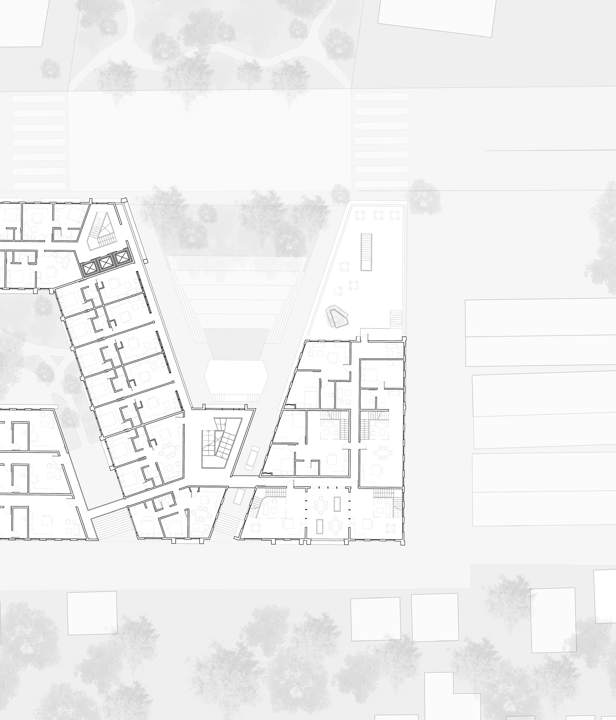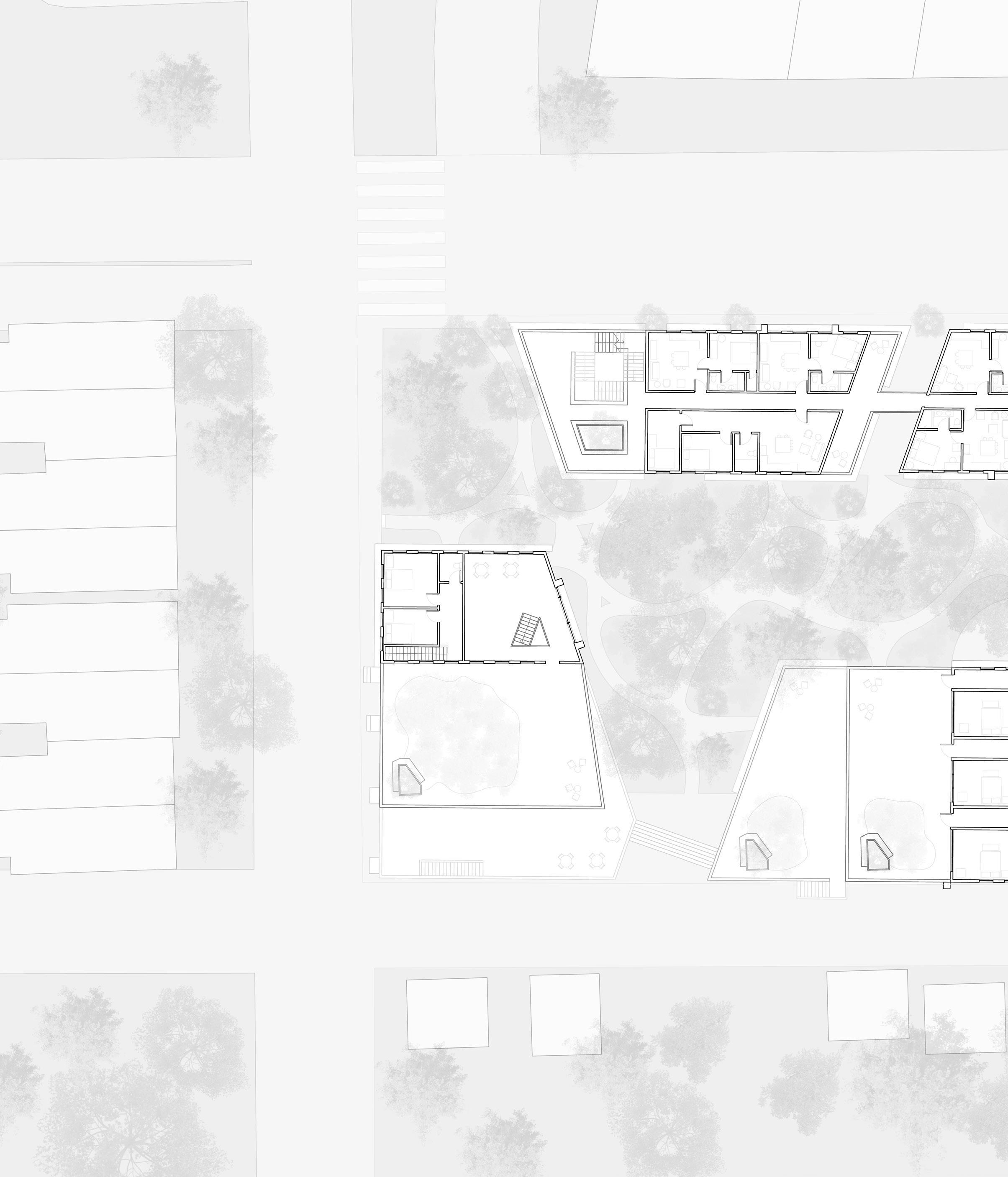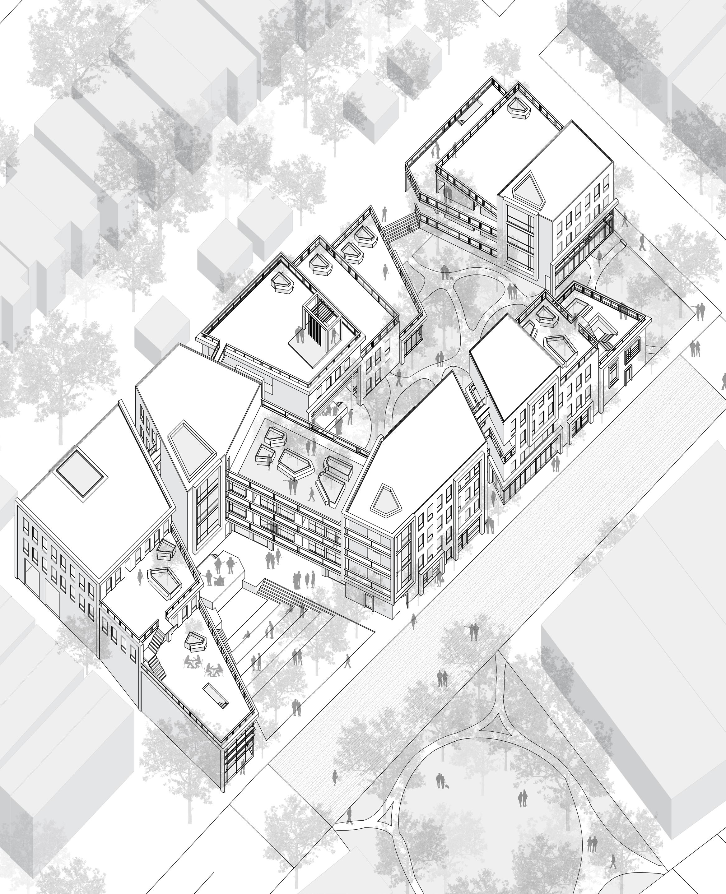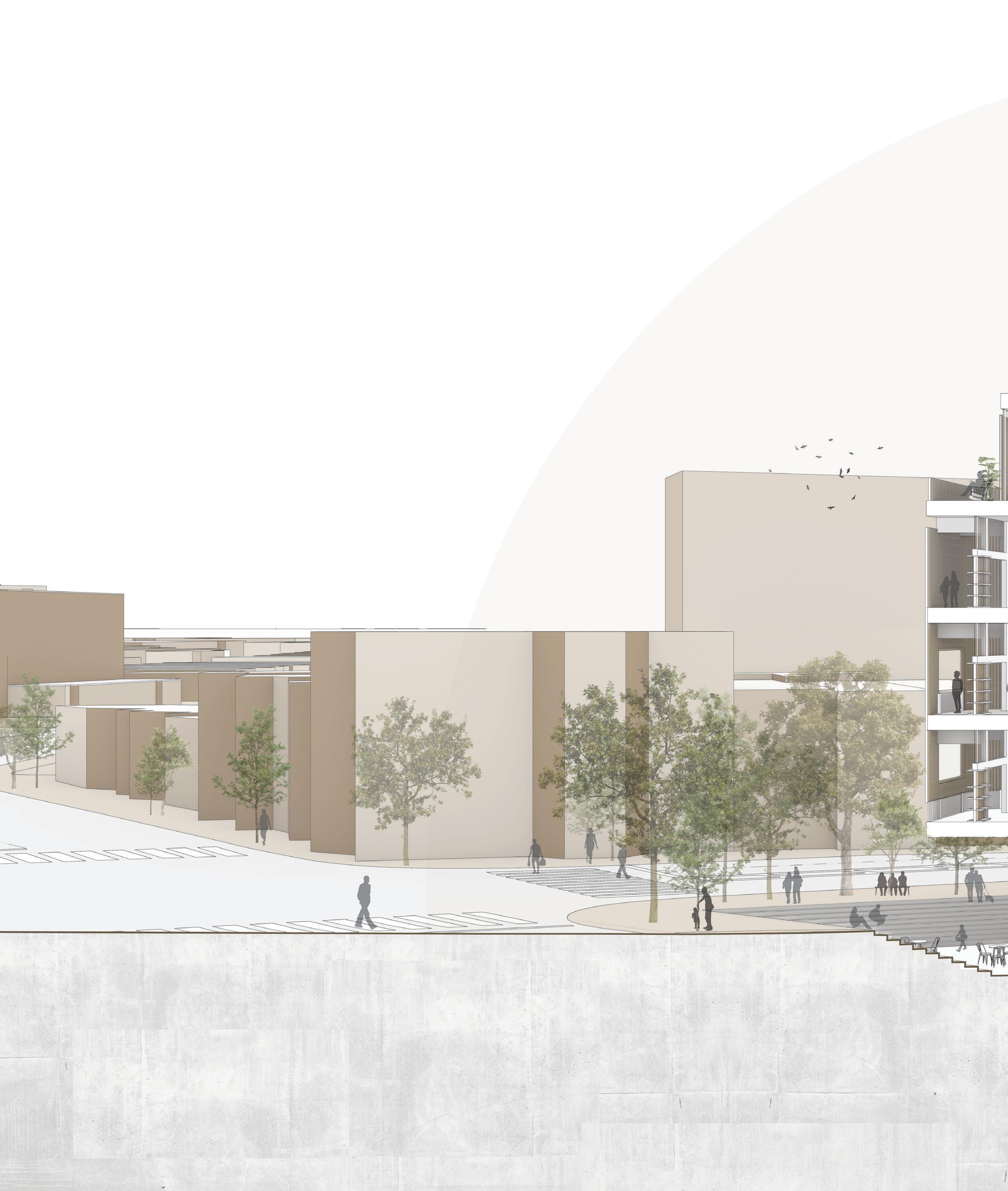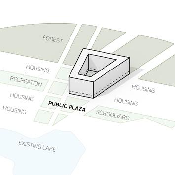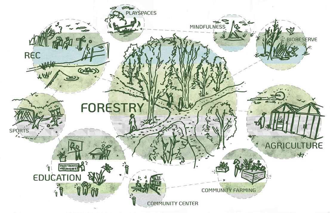 The overall urban strategy is driven by the creation of a forest belt to support nature-centered activities as well as an understanding of the urban grain from site-specific relationships and conditions.
