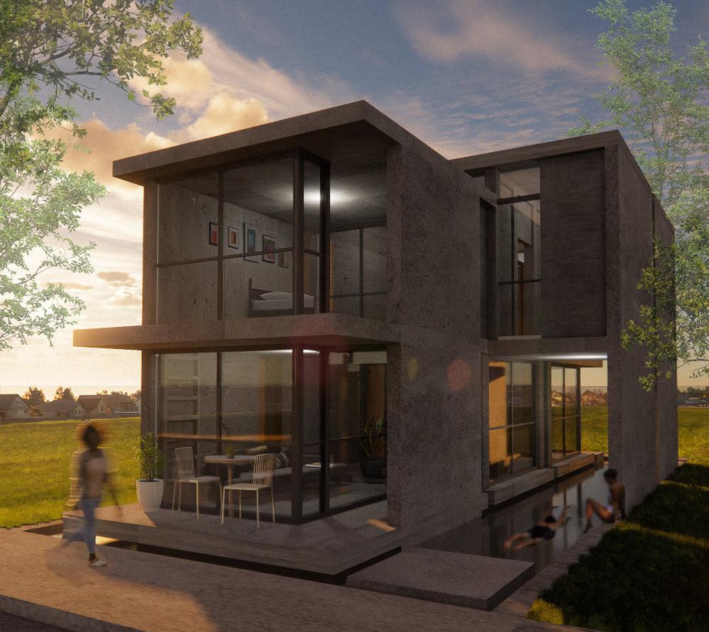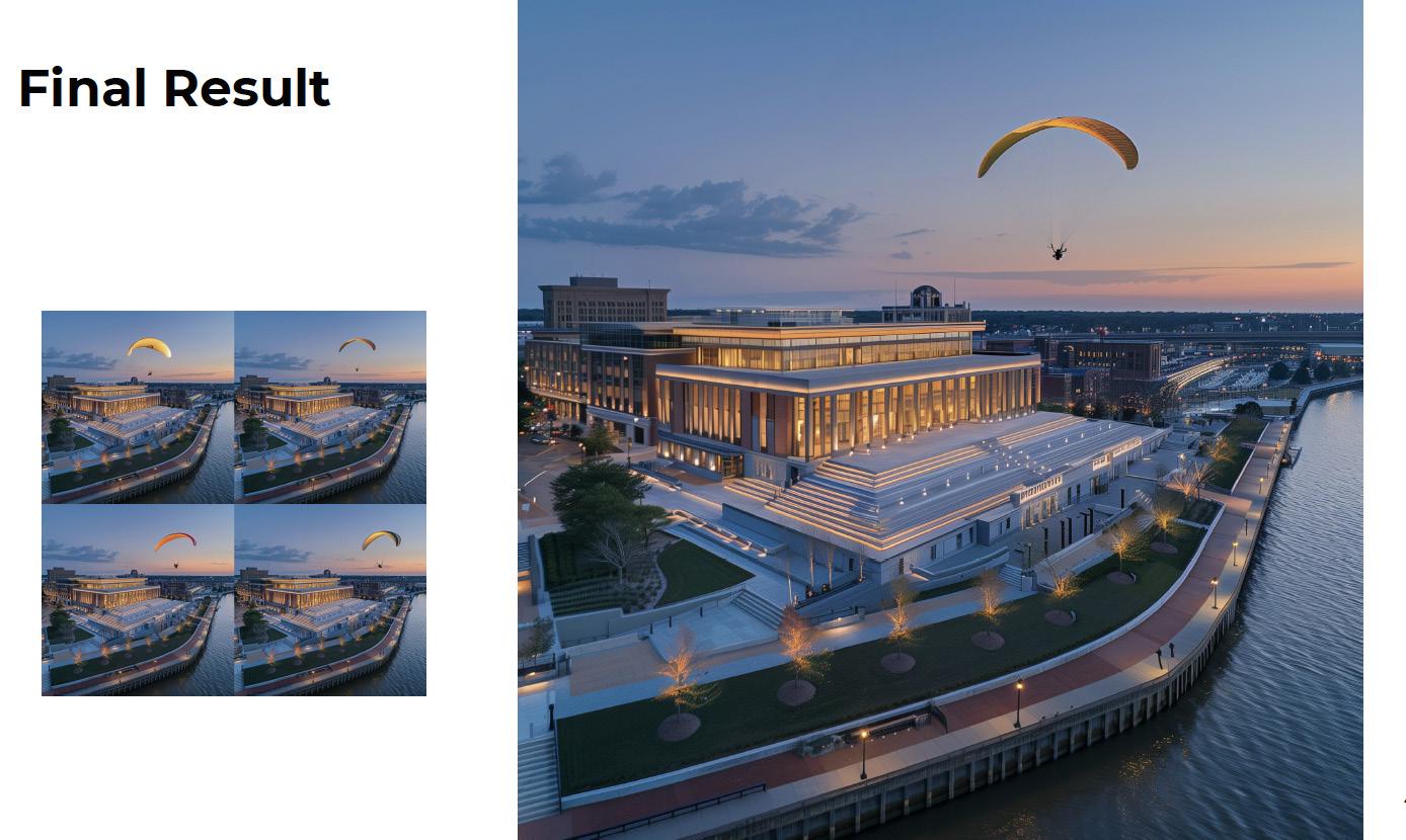 The two above renders of Cascade House, an original academic project from ARCH 2020, were created using text and image to render software, Rendair, including additional parameters programming lighting, geometry, and style reference as a part of independent research on using AI software in post production, inspiration and ideation, and other stages of workflow in architecture, presented to Quinn Evans architects’ Richmond Office. The base images pictured above were built through a 3D Rhino Model and Enscape renders with additional photoshop work and post-production editing.