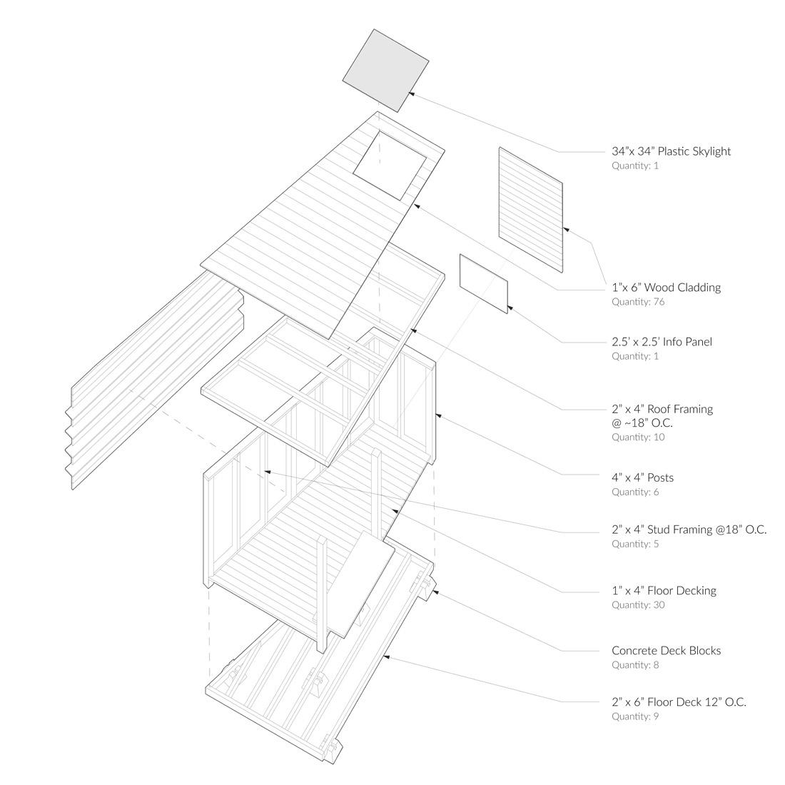 This trailhead pavilion was designed and built for Morven’s Trail System for the class, ARCH 5500, Processing the Anthopocene with JT Bachman. The design offers hikers a space to rest and reflect, using recycled plastic elements in the skylight and local wood. Our group’s three-pavilion design was selected by Morven stakeholders and narrowed to one to be constructed.