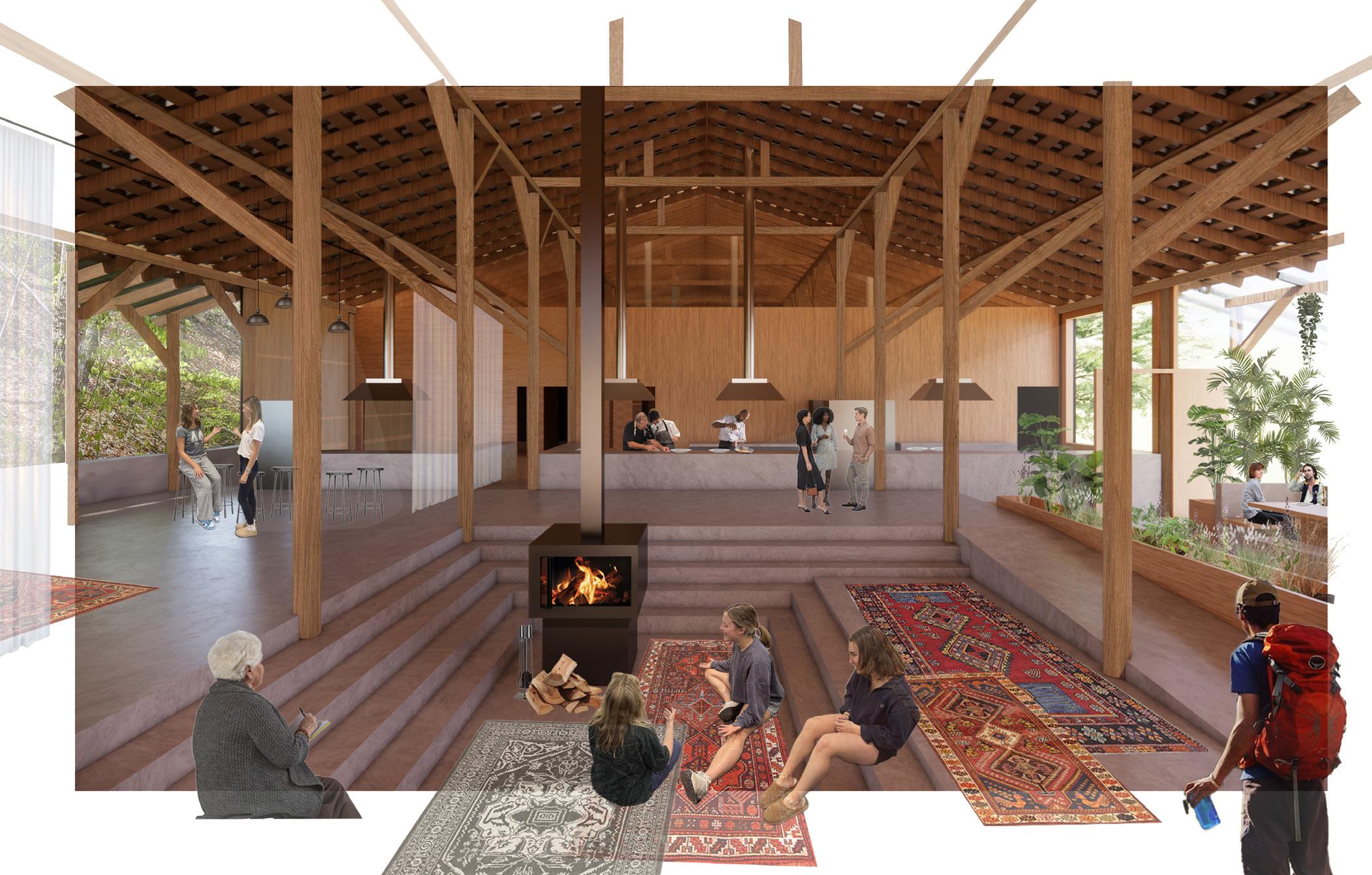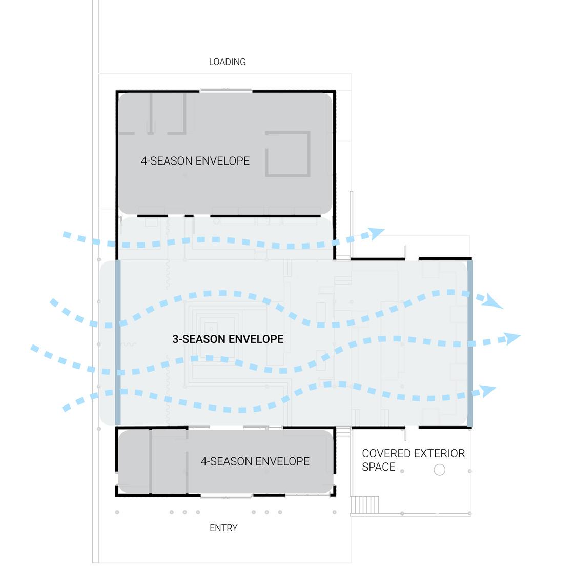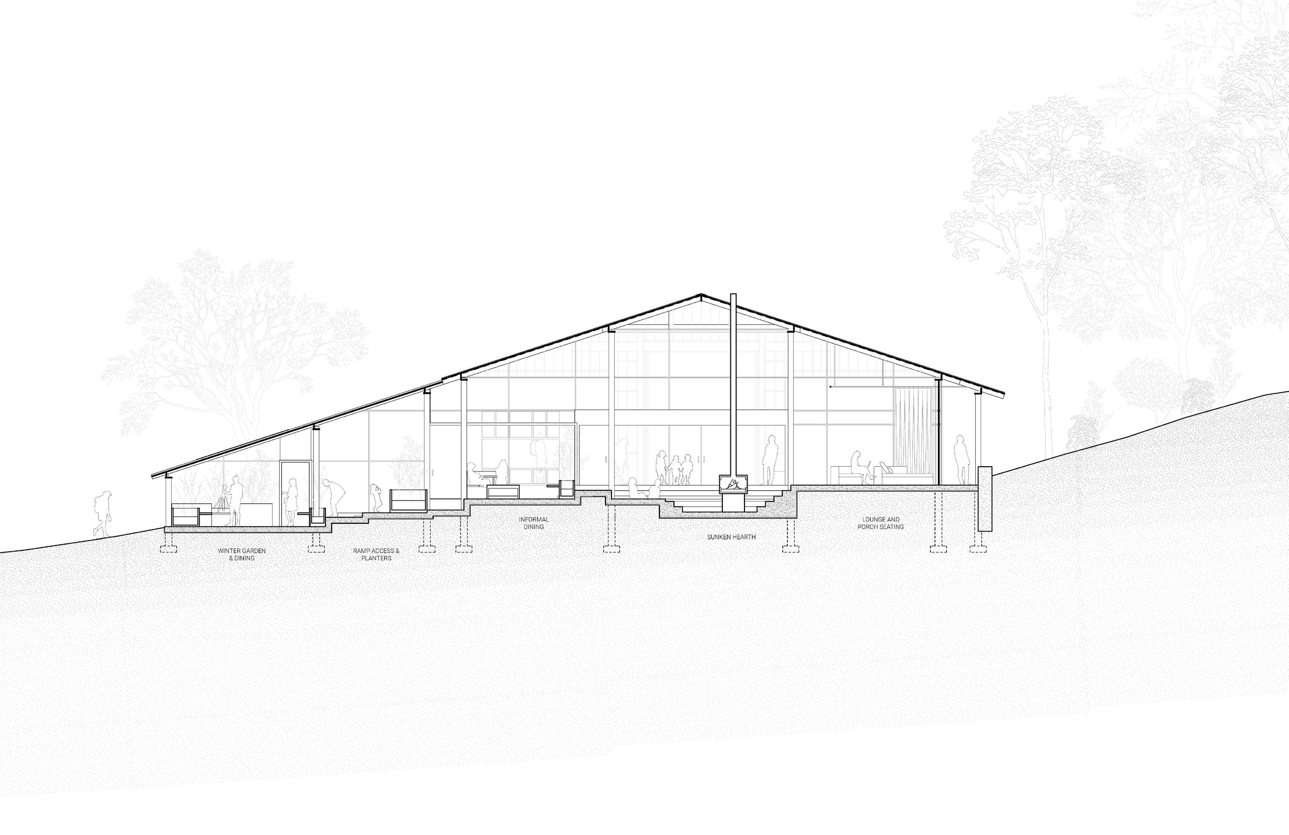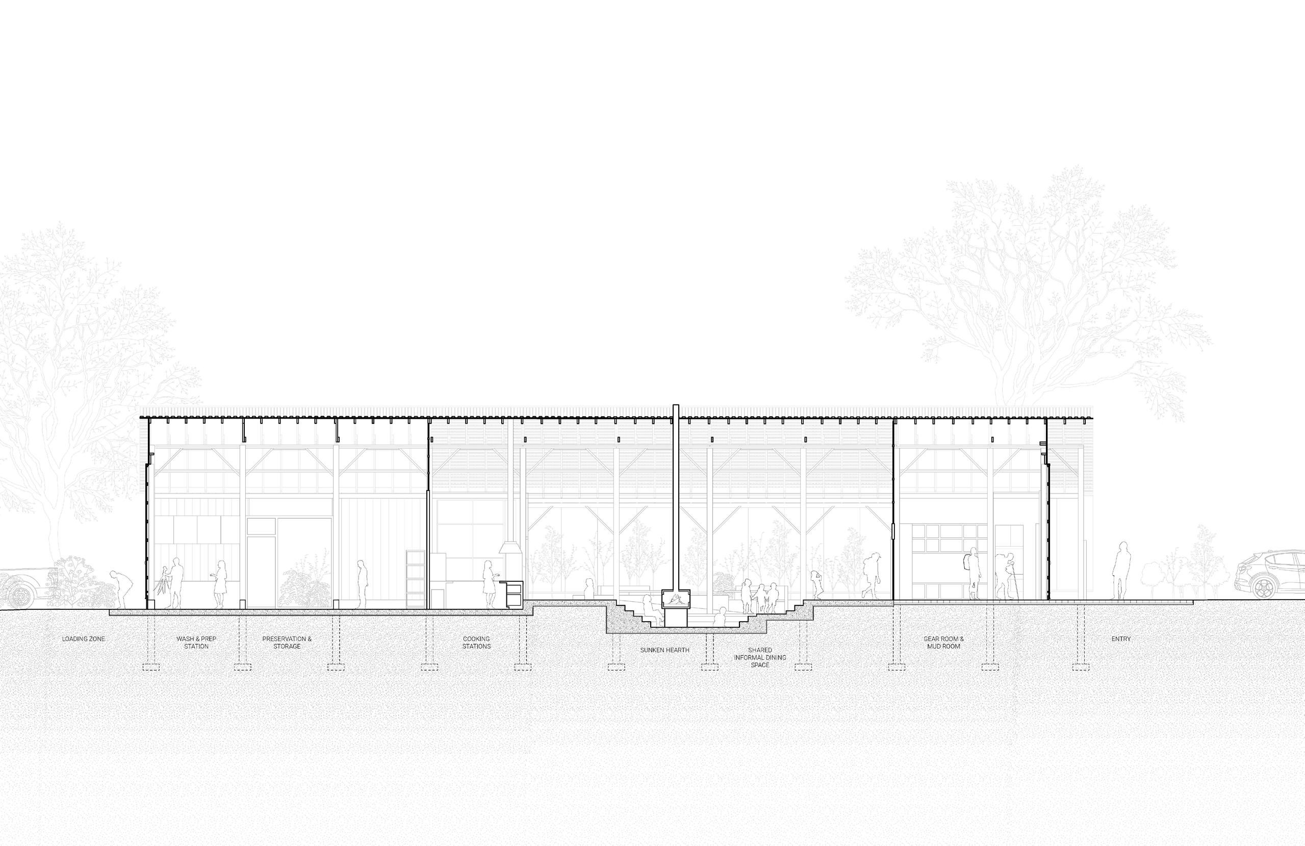 To extend the primary communal gathering and dining space of the outpost, a winter garden extends down the hill along a new northeast axis perpendicular to the northwest axis of the existing barn. The winter garden sinks down into the hill to follow the grade, accomodated by the changing floor system and a series of accessible ramps to navigate the hillside. The primary gathering space, rooted by a sunken hearth in the center of the barn, becomes a three-season space. During the summertime, the walls are slide open from either end of the building to allow for a gentle summer breeze to be funneled through the space along the northwest axis to provide passive conditioning during hot Virginia summers rather than using energy-intensive air conditioning systems.