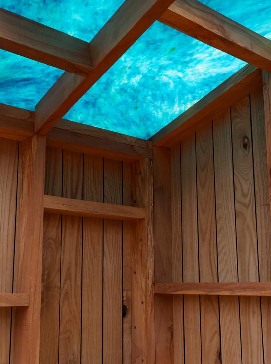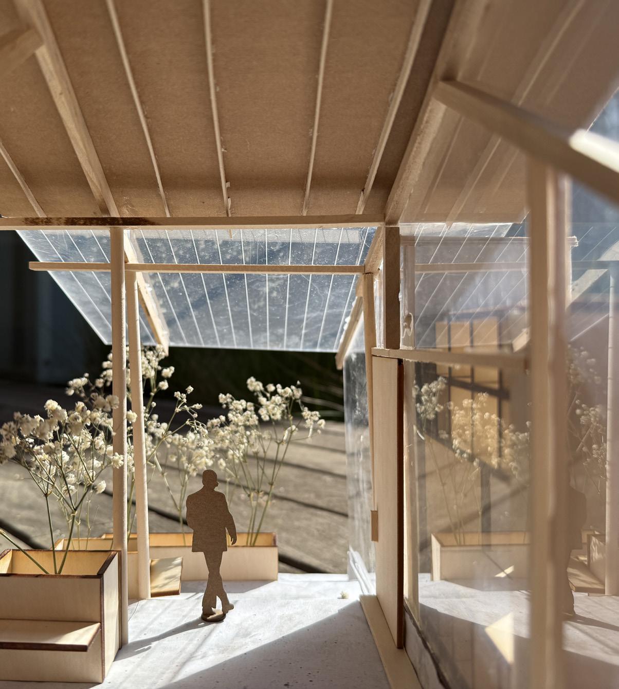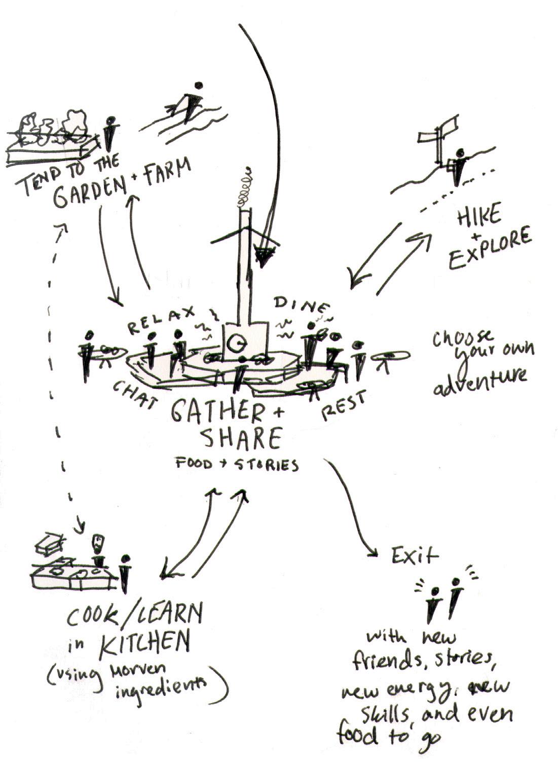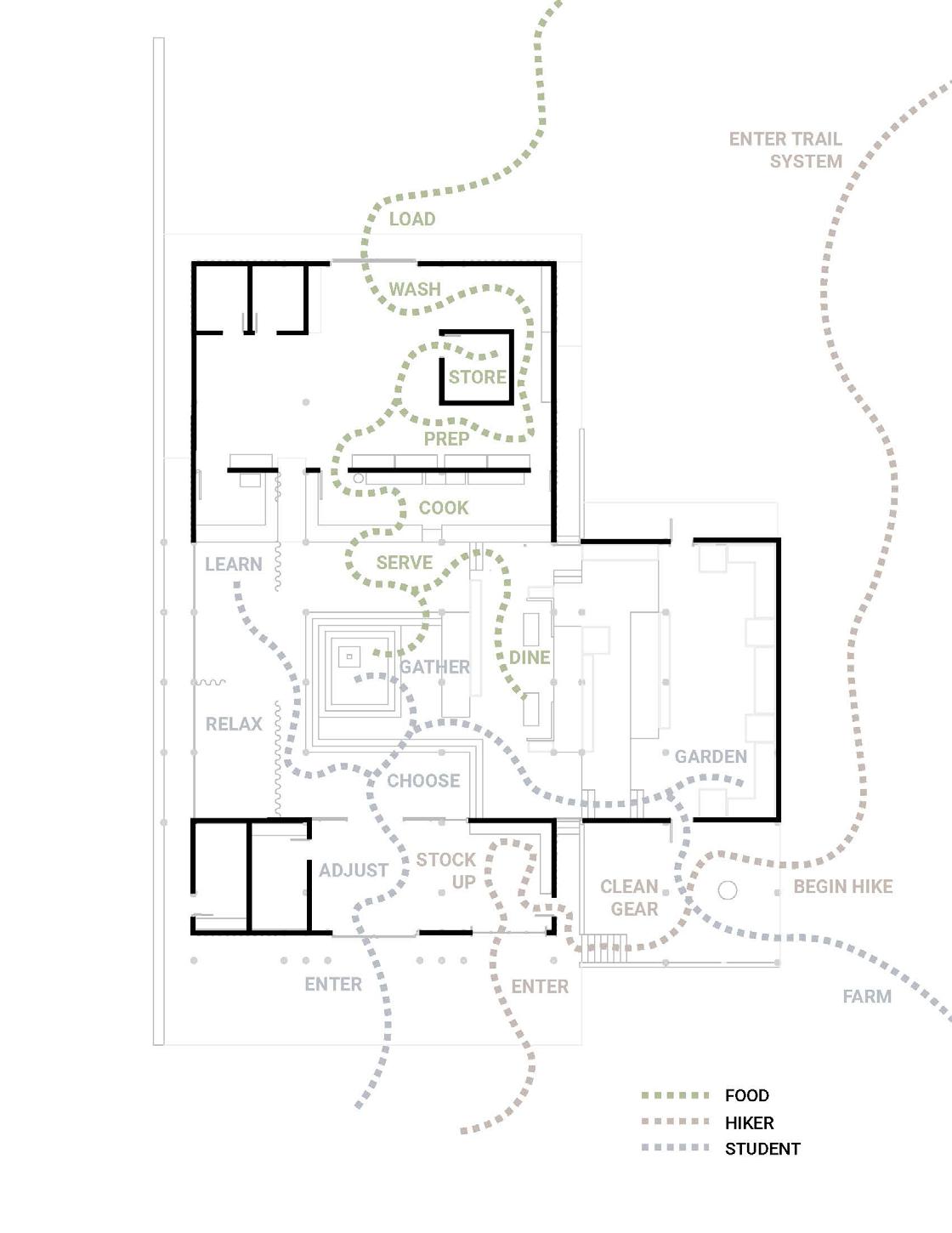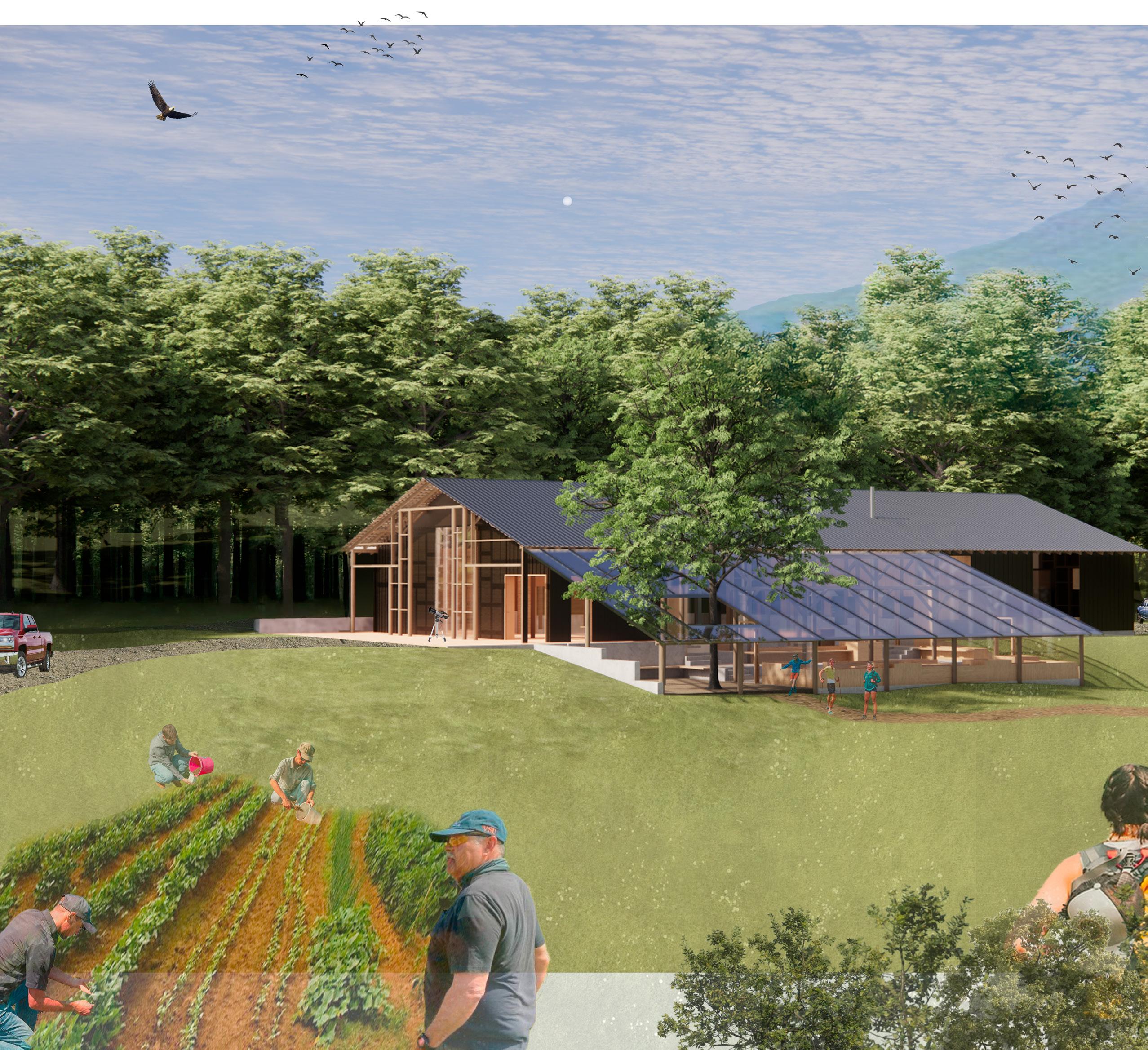 To extend the primary communal gathering and dining space of the outpost, a winter garden extends down the hill along a new northeast axis perpendicular to the northwest axis of the existing barn. The winter garden sinks down into the hill to follow the grade, accomodated by the changing floor system and a series of accessible ramps to navigate the hillside. The primary gathering space, rooted by a sunken hearth in the center of the barn, becomes a three-season space. During the summertime, the walls are slide open from either end of the building to allow for a gentle summer breeze to be funneled through the space along the northwest axis to provide passive conditioning during hot Virginia summers rather than using energy-intensive air conditioning systems.