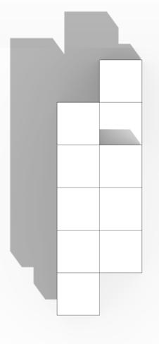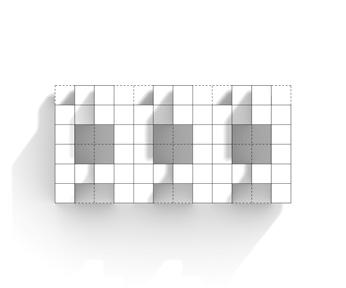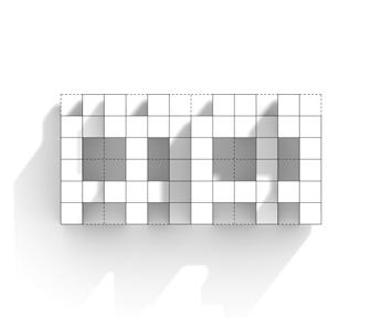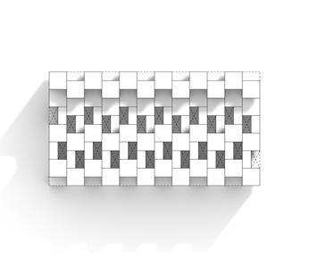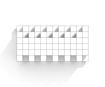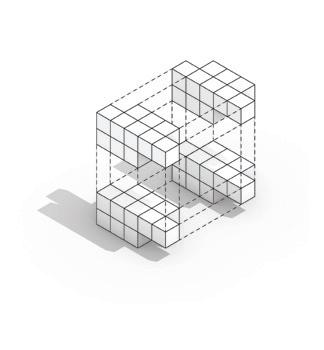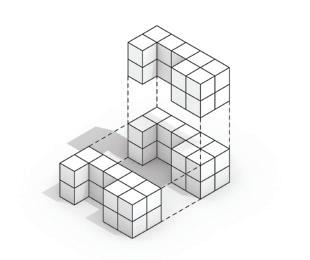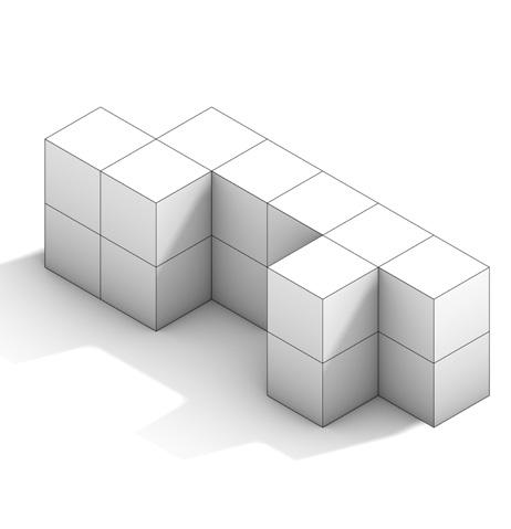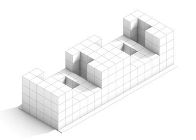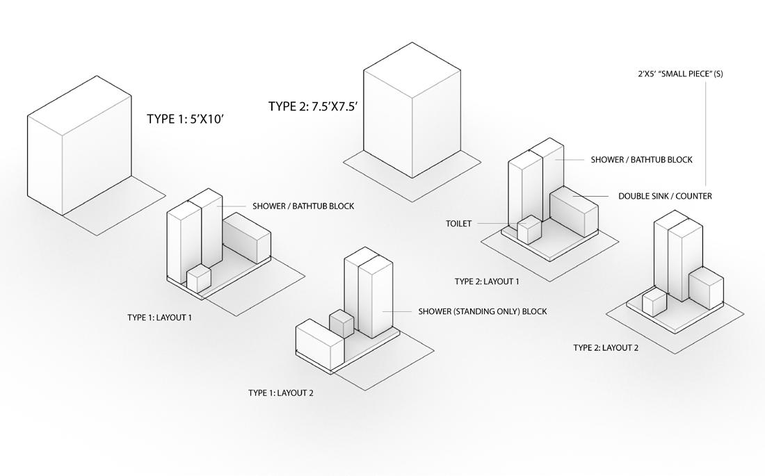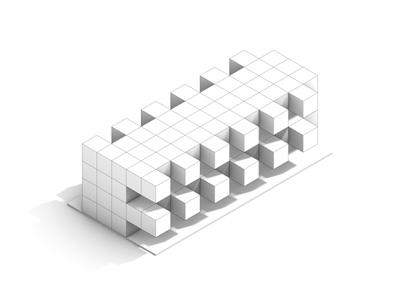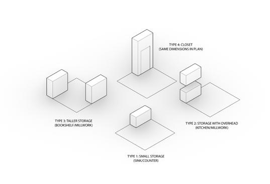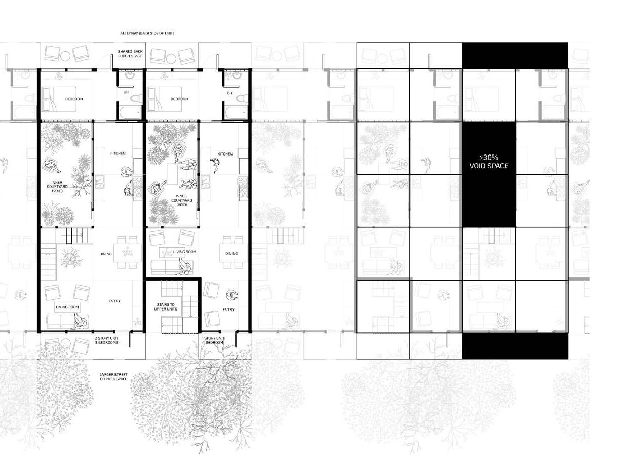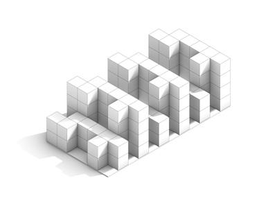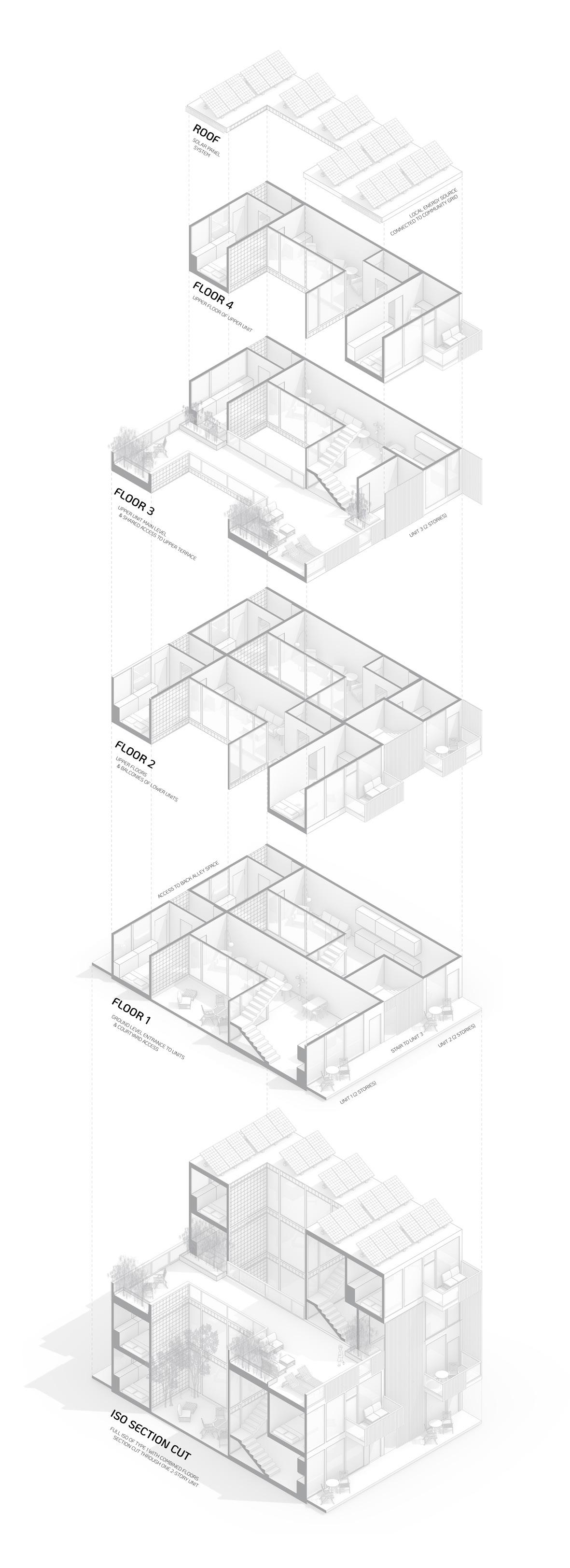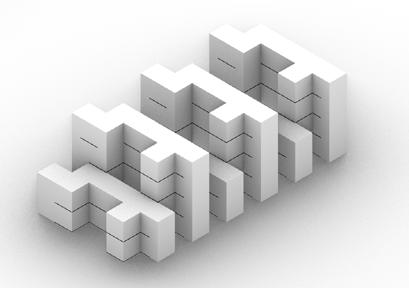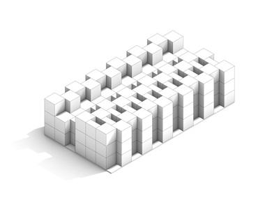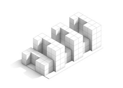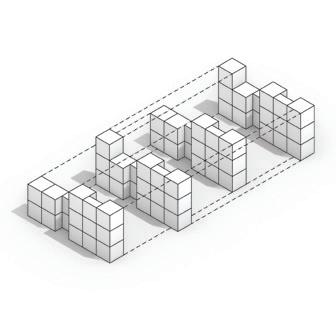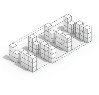 Matrix introduces four potential housing types with additional arrangement options for each type. Arrangements are shown in plan, isometric, and section (black). Massing is populated via a modular kit of parts.