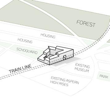Bands of housing are required to have a minimum of 30% void space and follow a dense, patio typology that consolidates private space and allows for more shared public space through the creation of active park bands, which hold markets, recreation, and more. Site-specific and contextual relationships inform both the direction of development and the strategic cuts where landscape elements are inserted. These cuts respond to existing conditions, including the central man-made lake in Aspern, forest belt connections, the existing train station, a key road toward Heidjochl, and the incoming rail line linking the site to the active urban core. While Aspern’s existing ring road does not determine the new urban grain, it remains as a secondary circulation loop, allowing movement around a dense and ecologically integrated city center.
