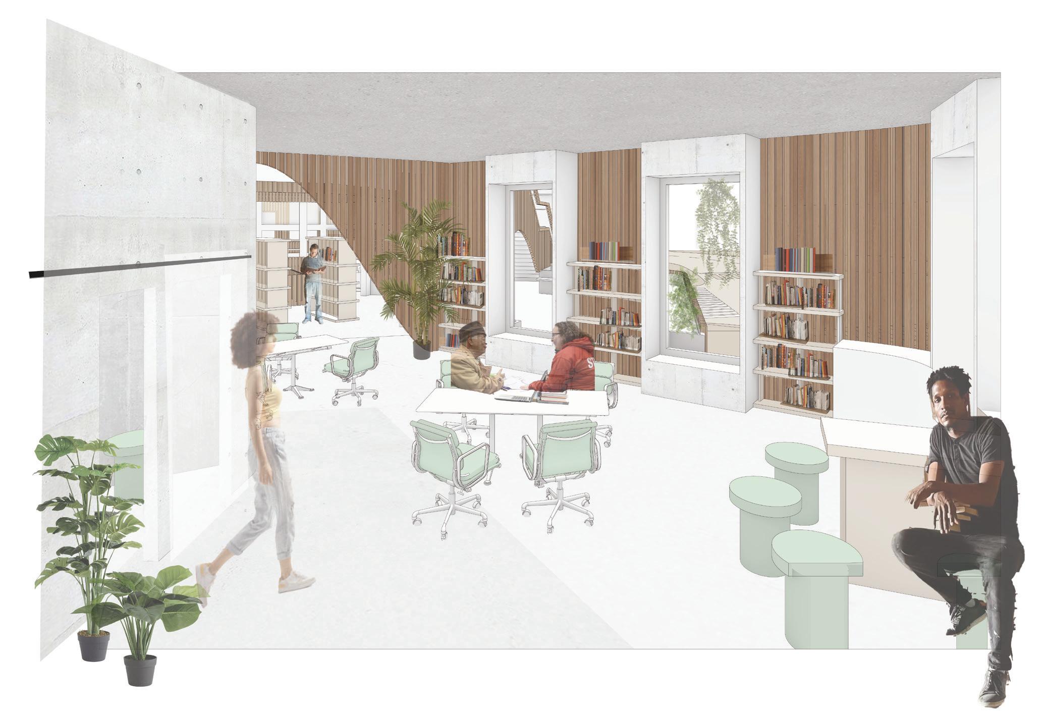 Interior Perspectives: Housing Resource Center (Above) & Circulation Space (Below)