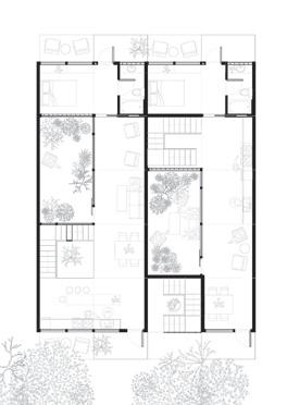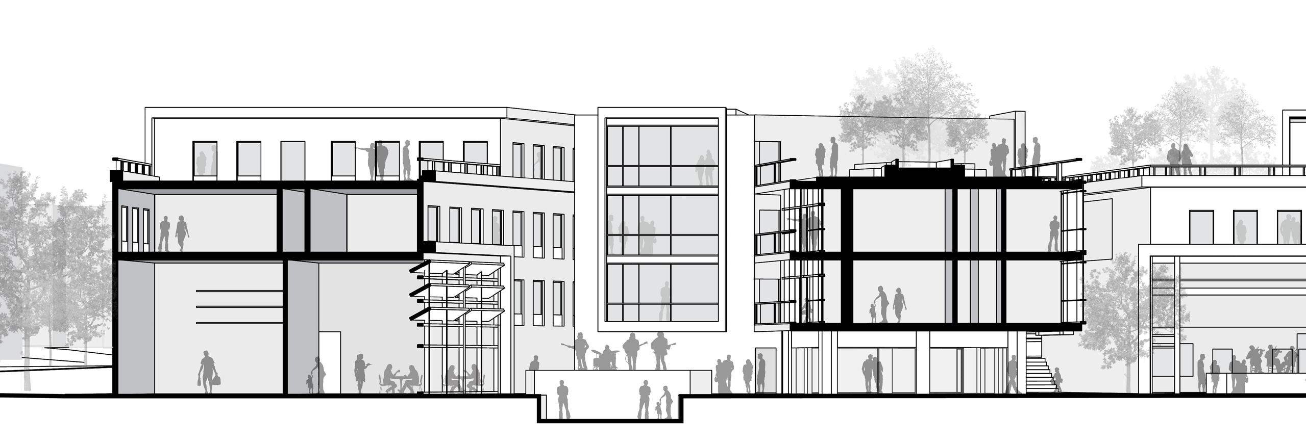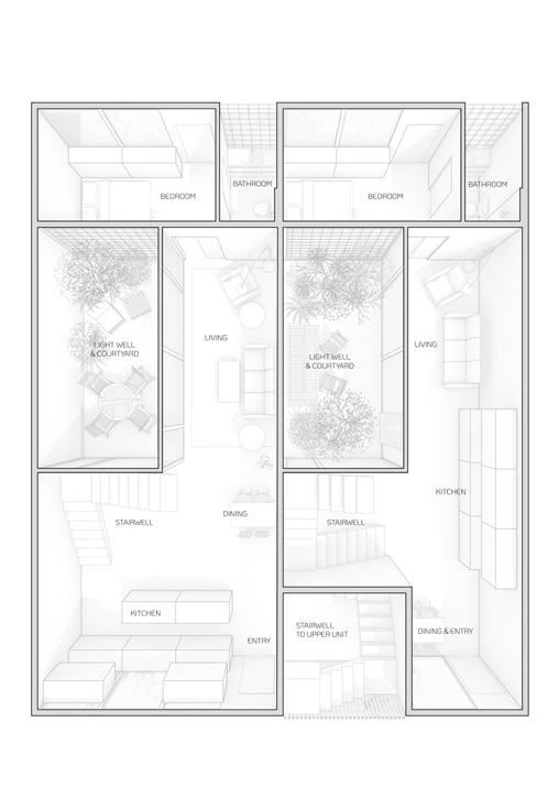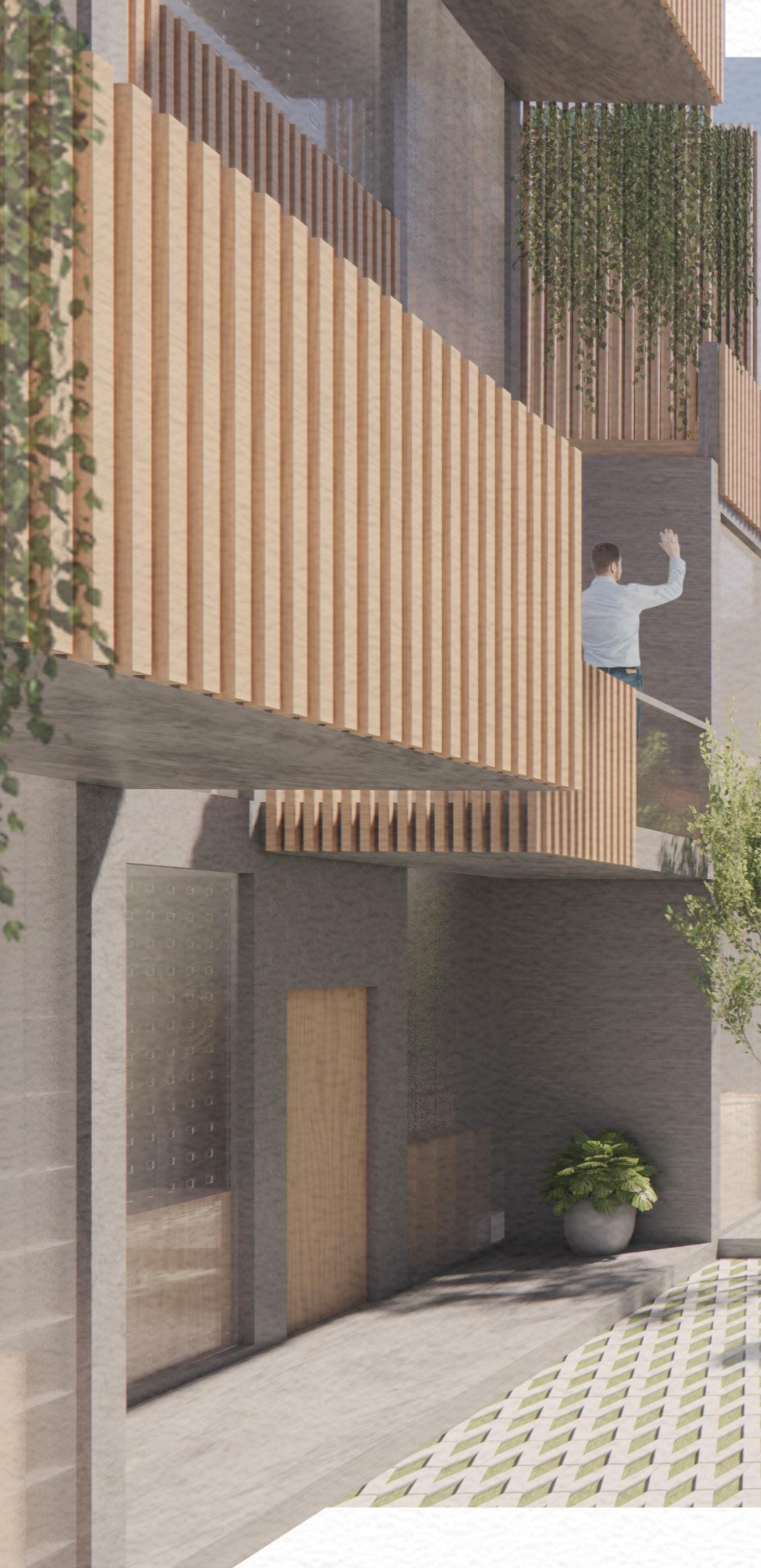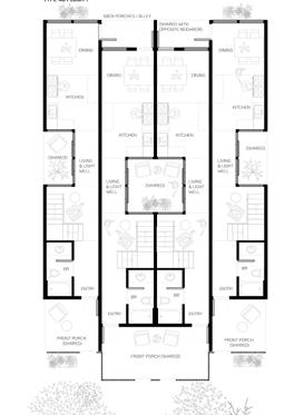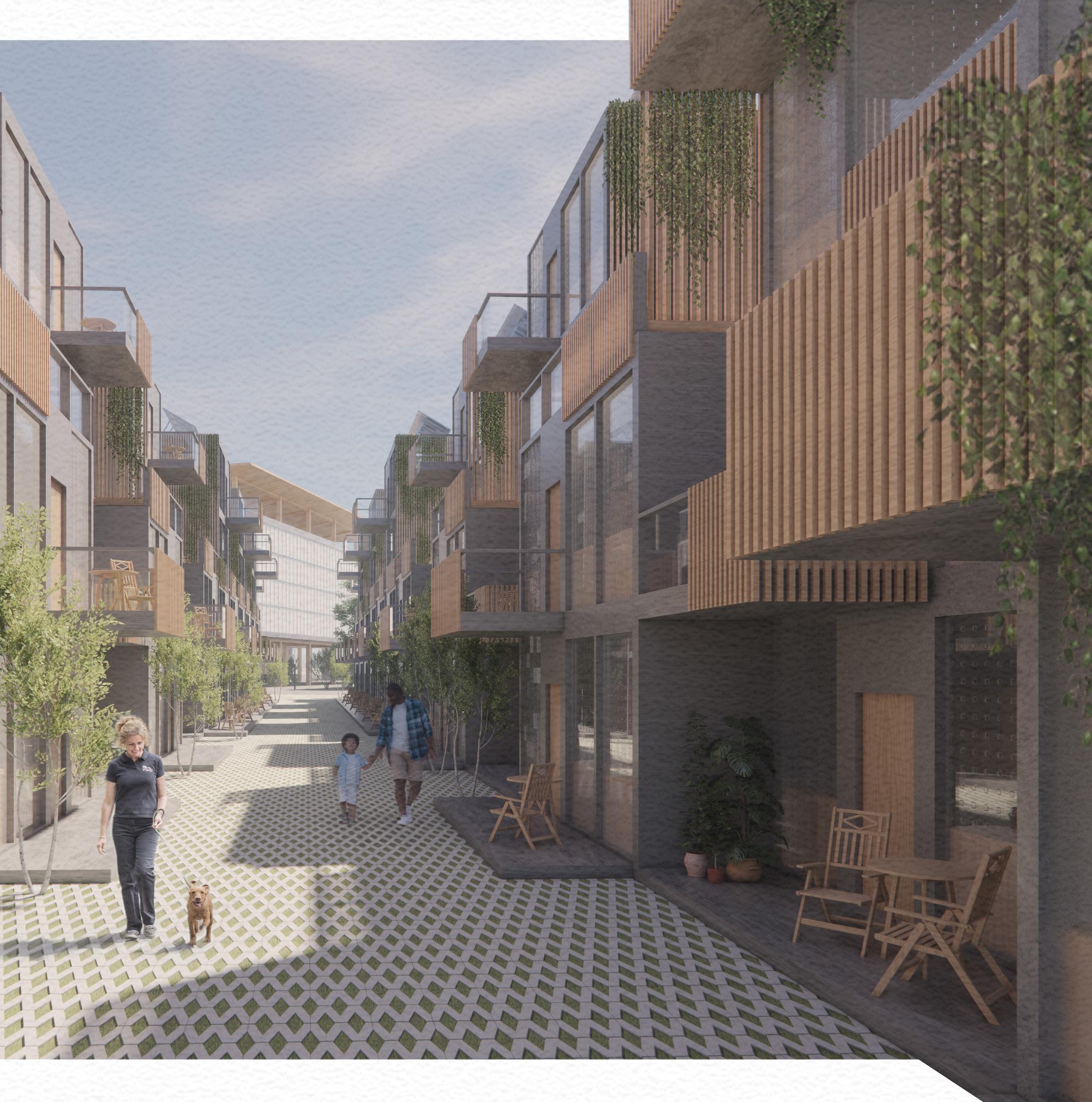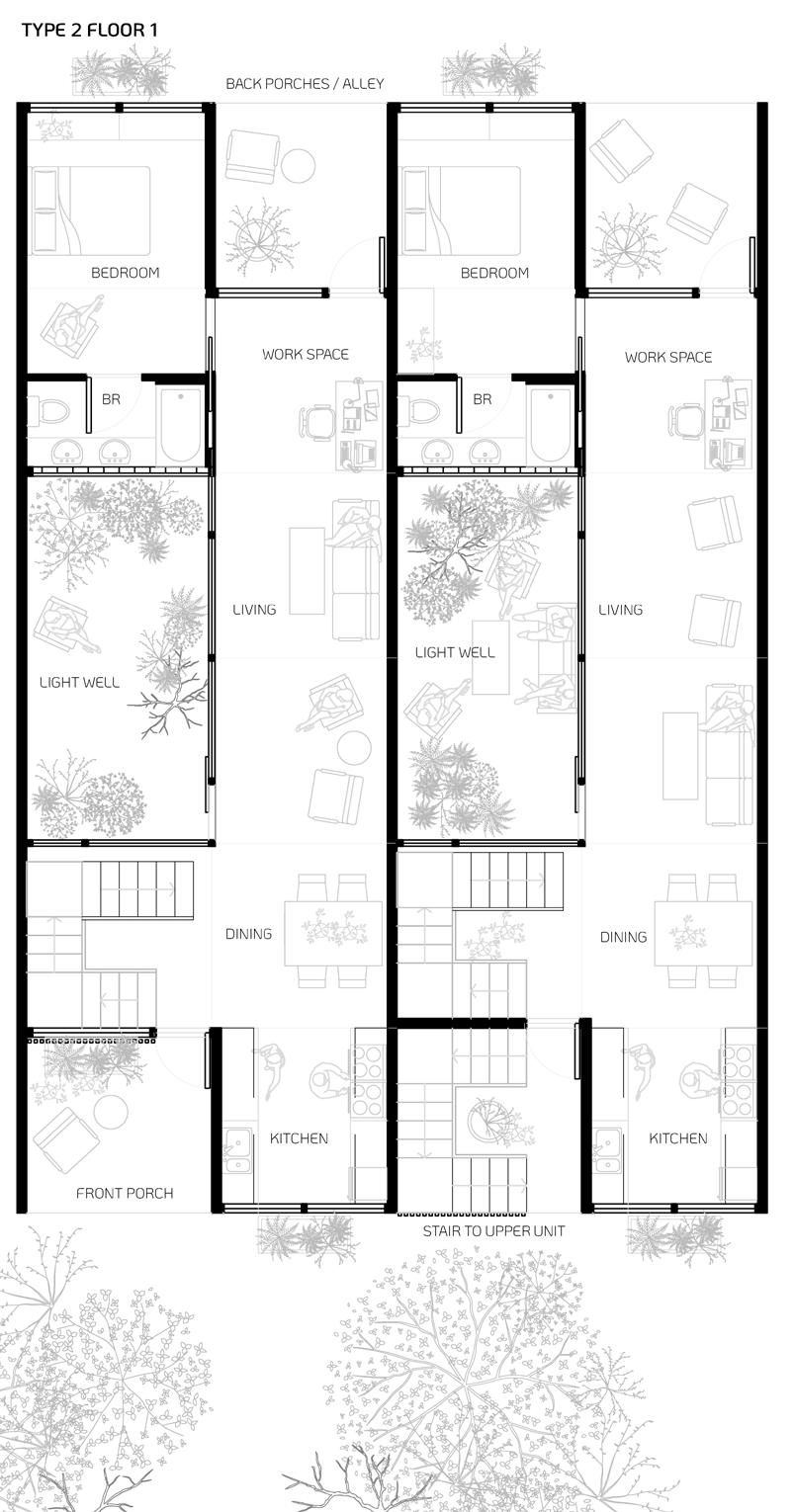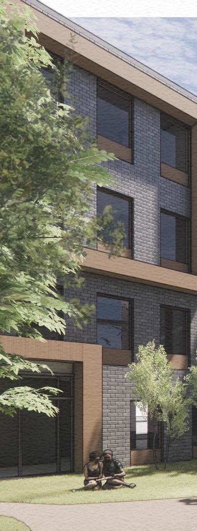 New Angle RVA is a mixed-use collective housing community offering options for equitable housing in the central Richmond area. The variation in unit type and style stems from the site’s unique position along the border of the Fan District and Scott’s Addition in Richmond, and the overall design seeks to blur the lines between these two districts. While allowing more green space to creep north into the outskirts of the Scott’s Addition, the small business-oriented and lively culture of Scott’s Addition are pulled across Broad street through the urban redesign of the surrounding blocks. Pedestrians are drawn into a public performance space within the project through the conversion of a nearby parking lot into a connecting green space.