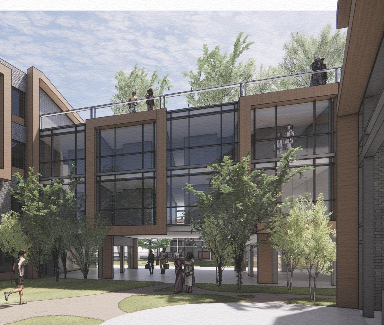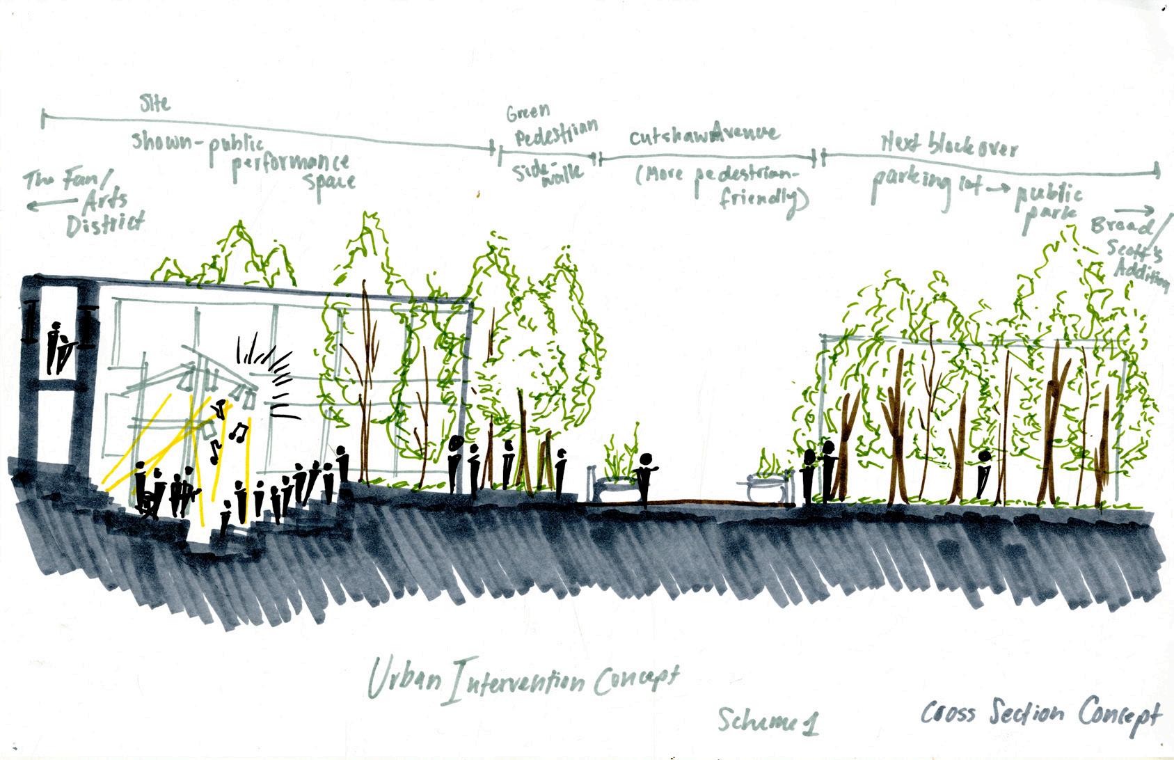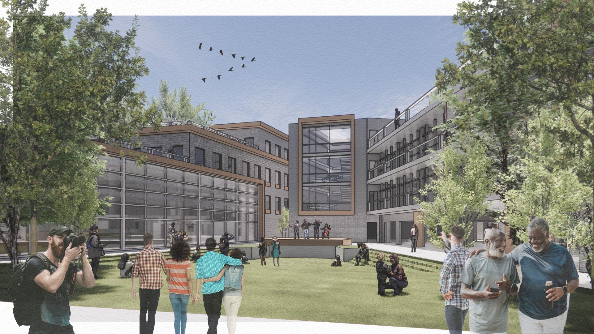 Opposite to the public courtyard and amphitheater is the private courtyard for residents only, surrounded by structures that begin to step down to the scale of the homes on the south side of the site in the Fan. Cutshaw avenue adjacent to the project would be converted to a more pedestrian-friendly and walkable space, with access to the mixed-use and small business spaces on the ground level. Green space stretches through the site with organic paths that allow for residents to navigate through a central natural area, following a pattern that contrasts the sharp and orthogonal design language of the structures themselves.