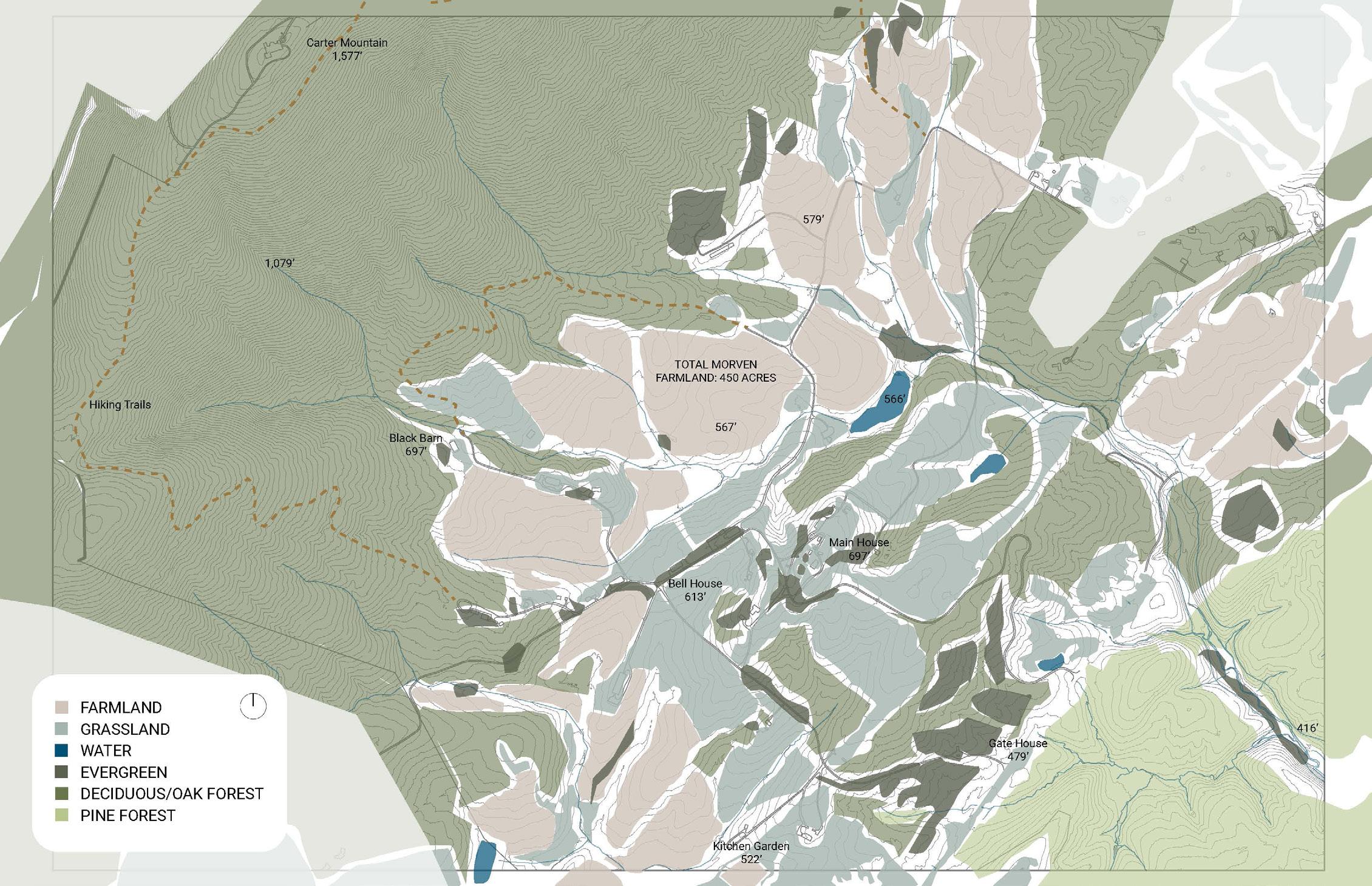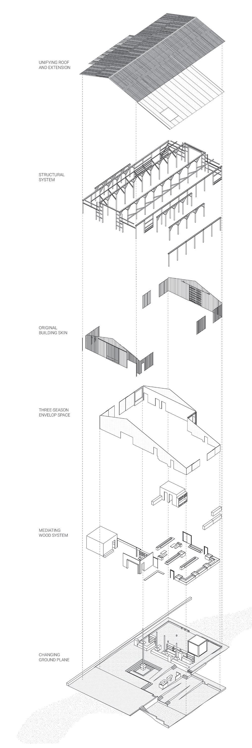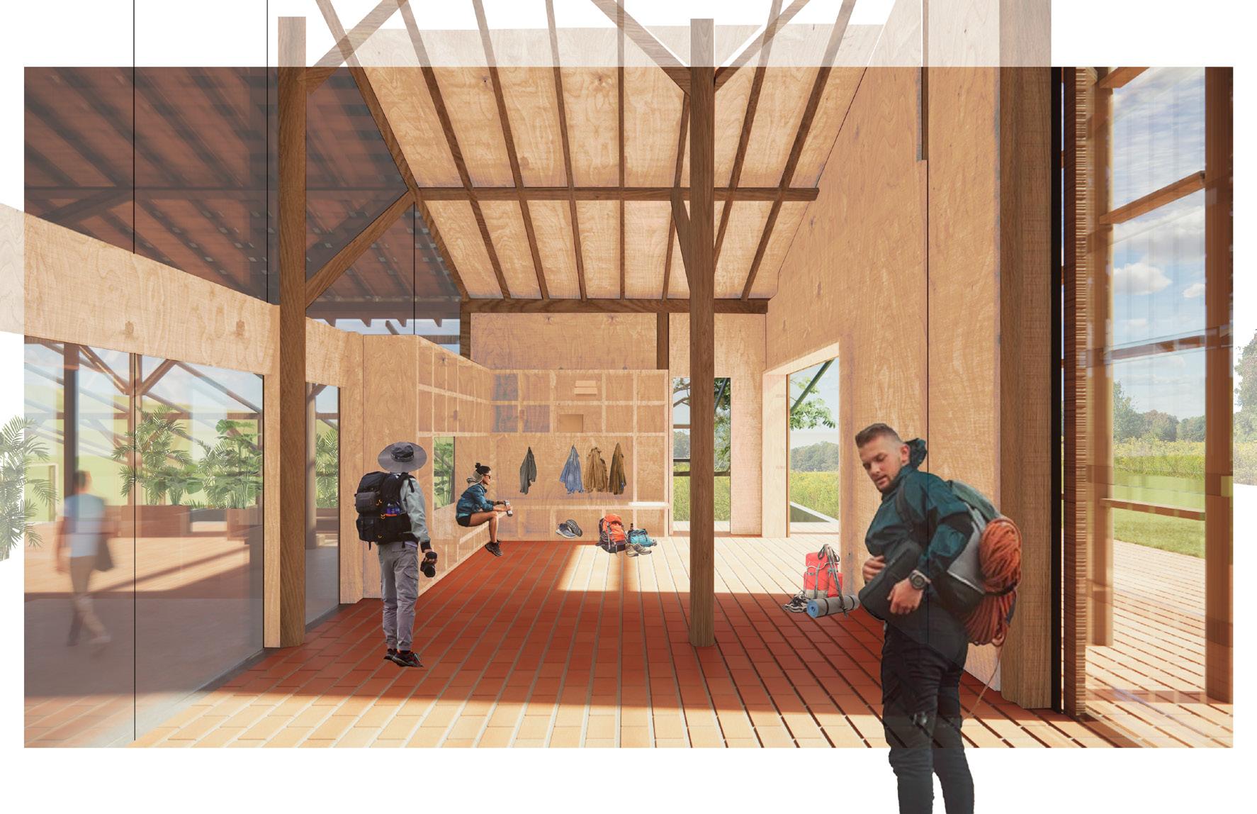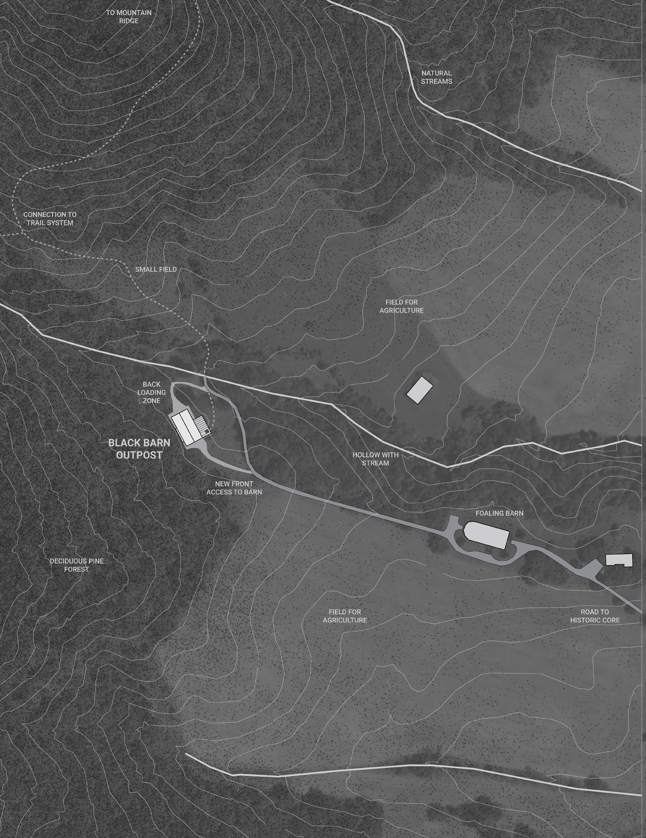 The Morven Outpost is an adaptive reuse project proposal that seeks to repurpose the Black Barn, an old hay barn, at UVA’s Morven Sustainability Lab as a hub to all the many experiences that happen in the Northwest sector of the 3000+ acre property and rich cultural landscape. The design seeks to maintain the bones of the original hay barn; it preserves the original structure and roofline, as well as elements of the siding. To accomodate the people and activities this barn will now facilitate, from cooking, learning, resting, dining, and building relationships, the dirt ground is replaced by a new fluctuating floor system that follows change in program and experience. A third system of light wooden elements is integrated into the structural system of the barn, dictating seating, entrances, and human-scale architecture, to mediate the other two systems of roof and changing floor.