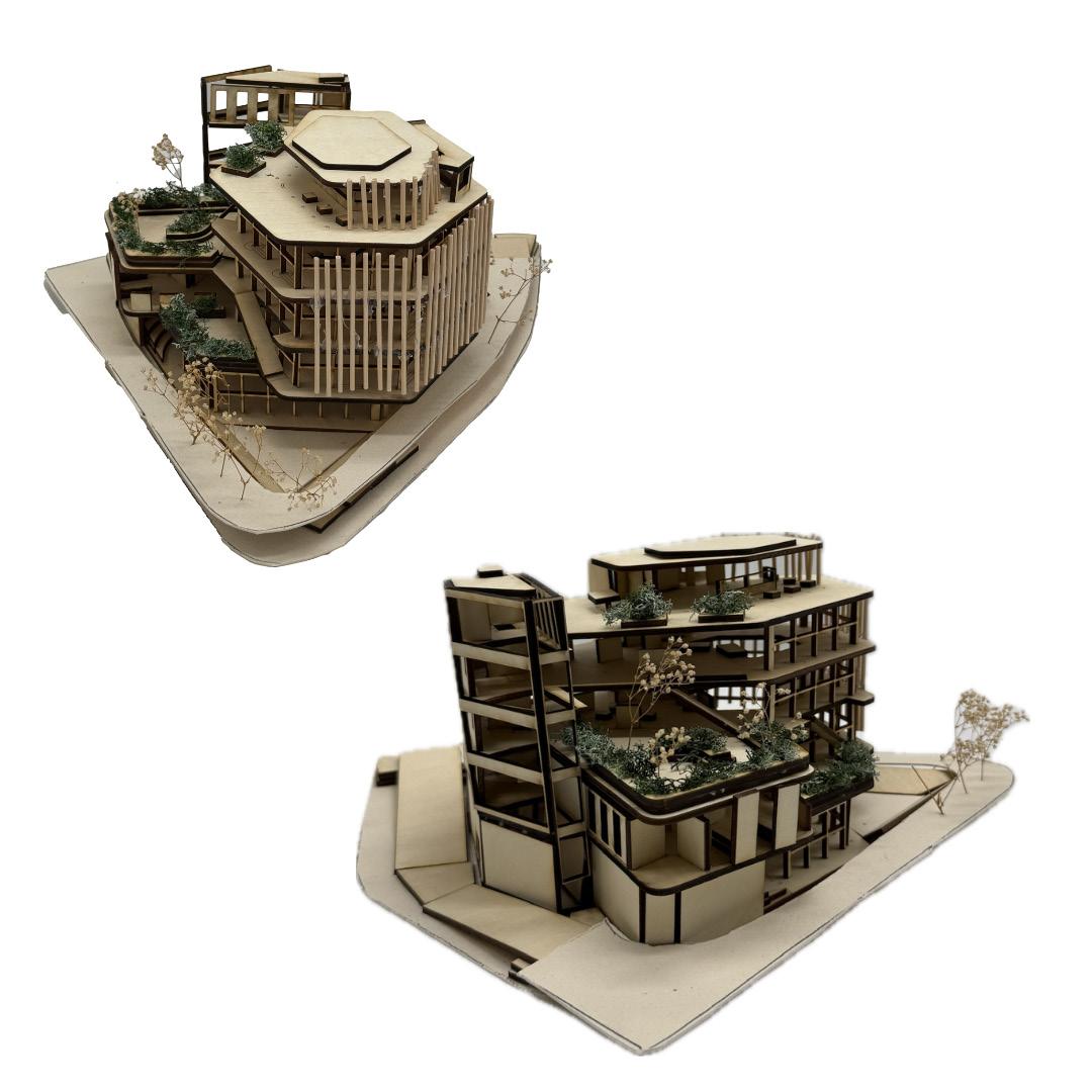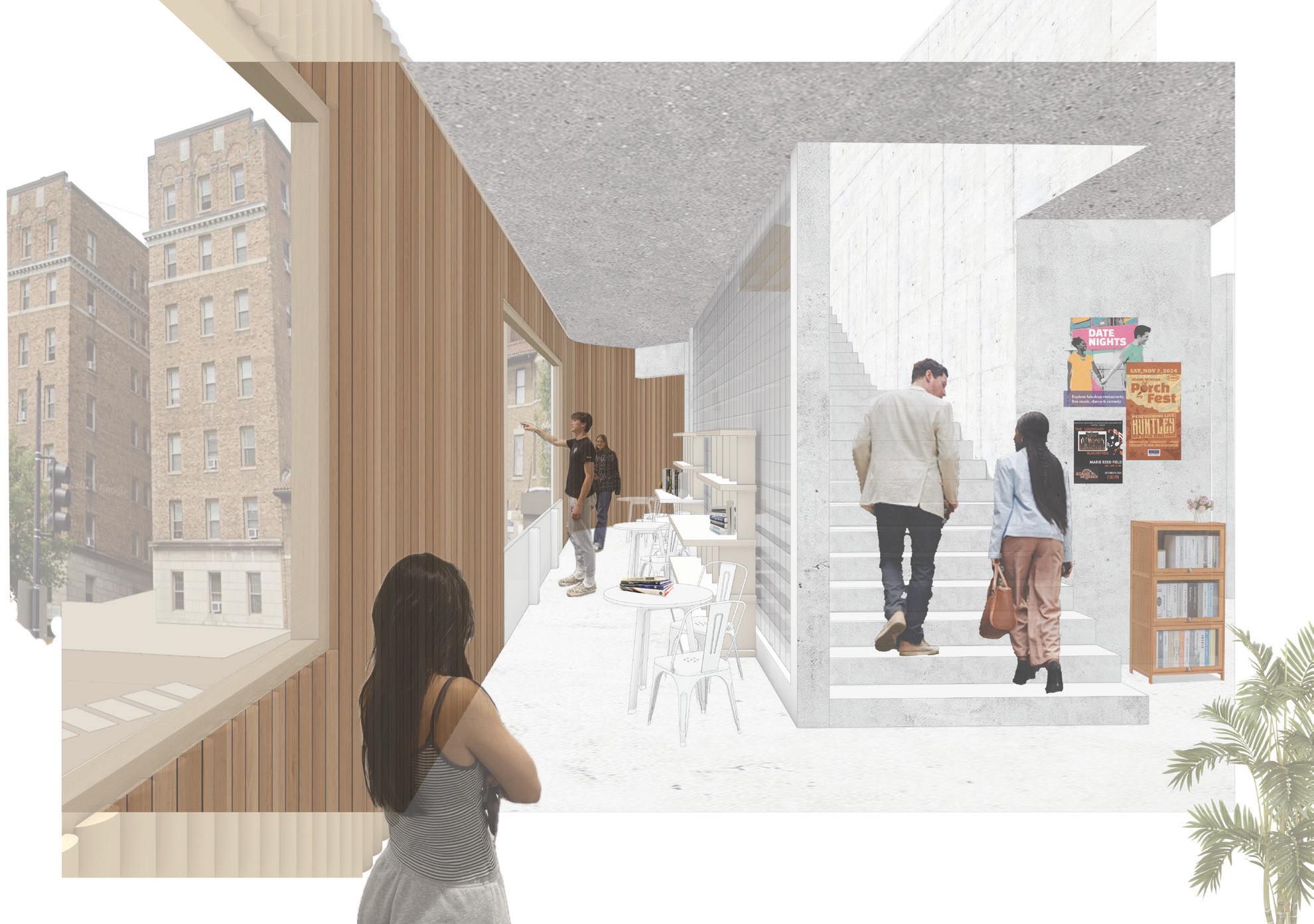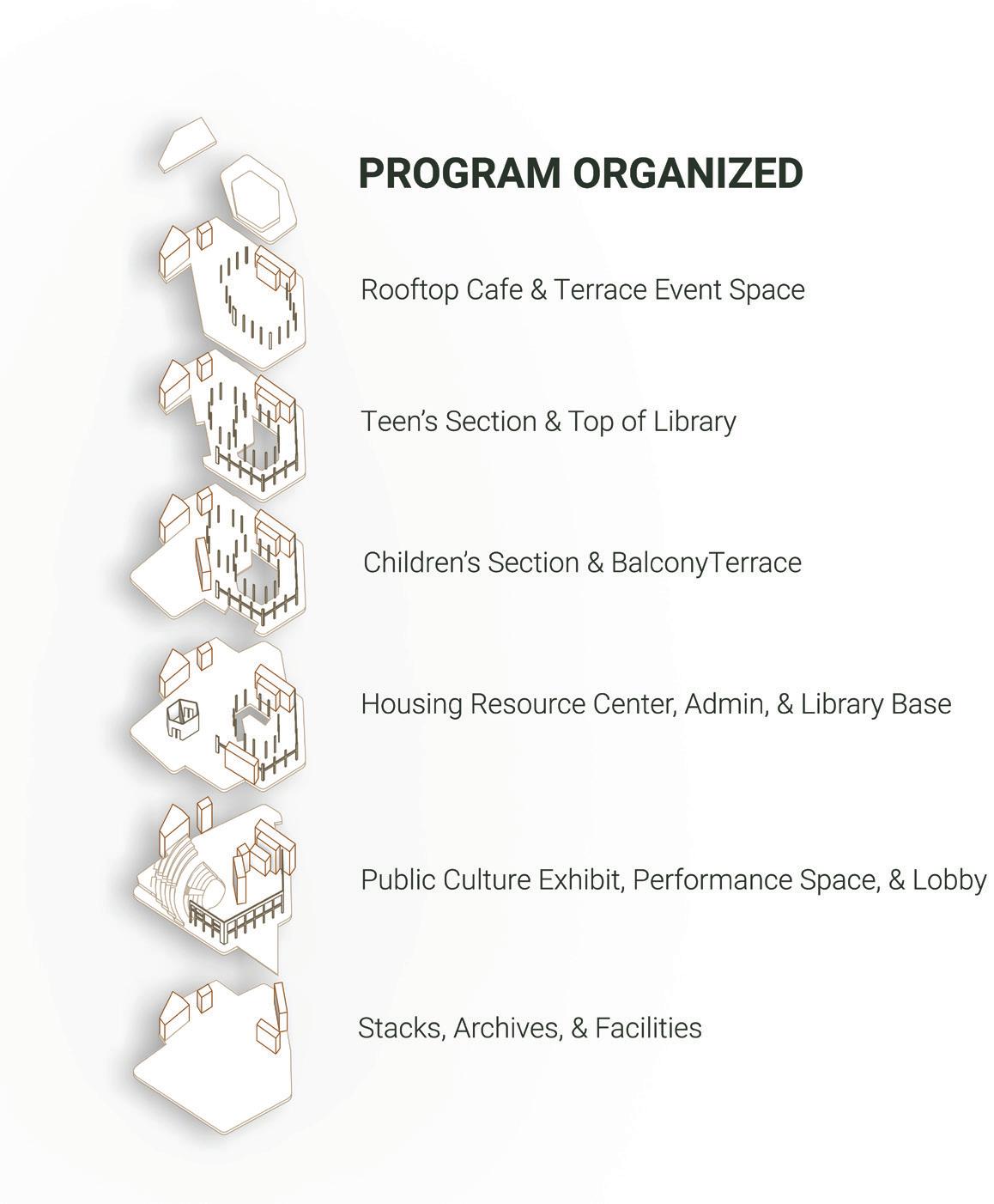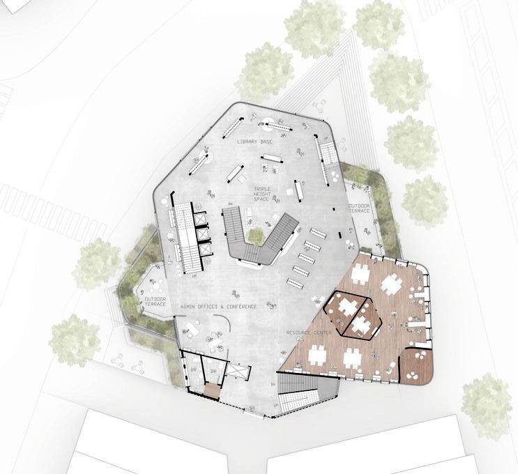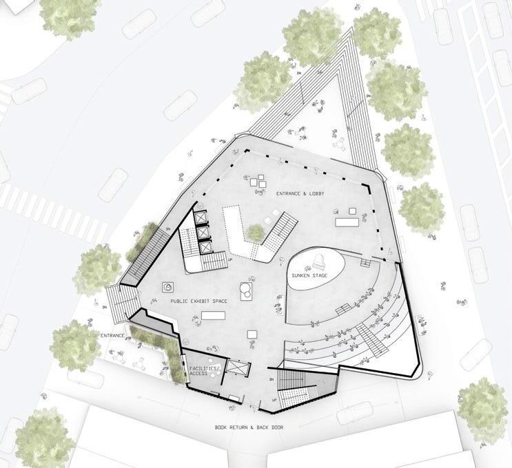 This scheme represents a design proposal for a civic center in Adams Morgan DC. Its spatial organization and form combines a modern library and civic resource center in order to support the diverse population of the surrounding neighborhood. The monumentality of the project works to make the building act as a beacon, emphasizing wayfinding and offering a new sense of identity to arguably the most central and lively intersection in this historic neighborhood. The scheme is designed with a set of tiered off floors and levels which