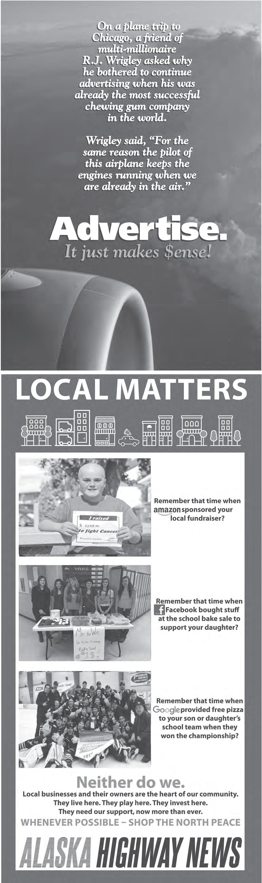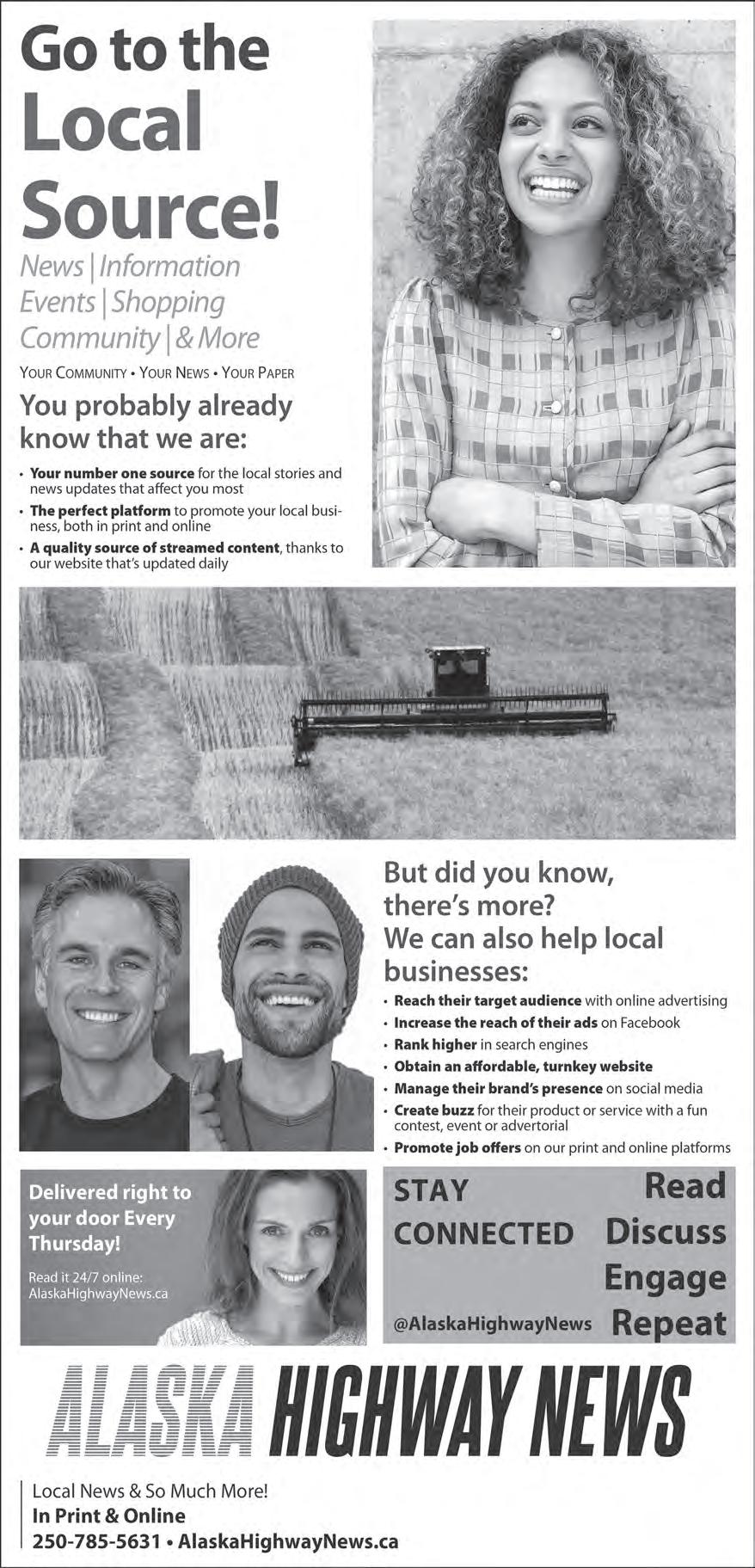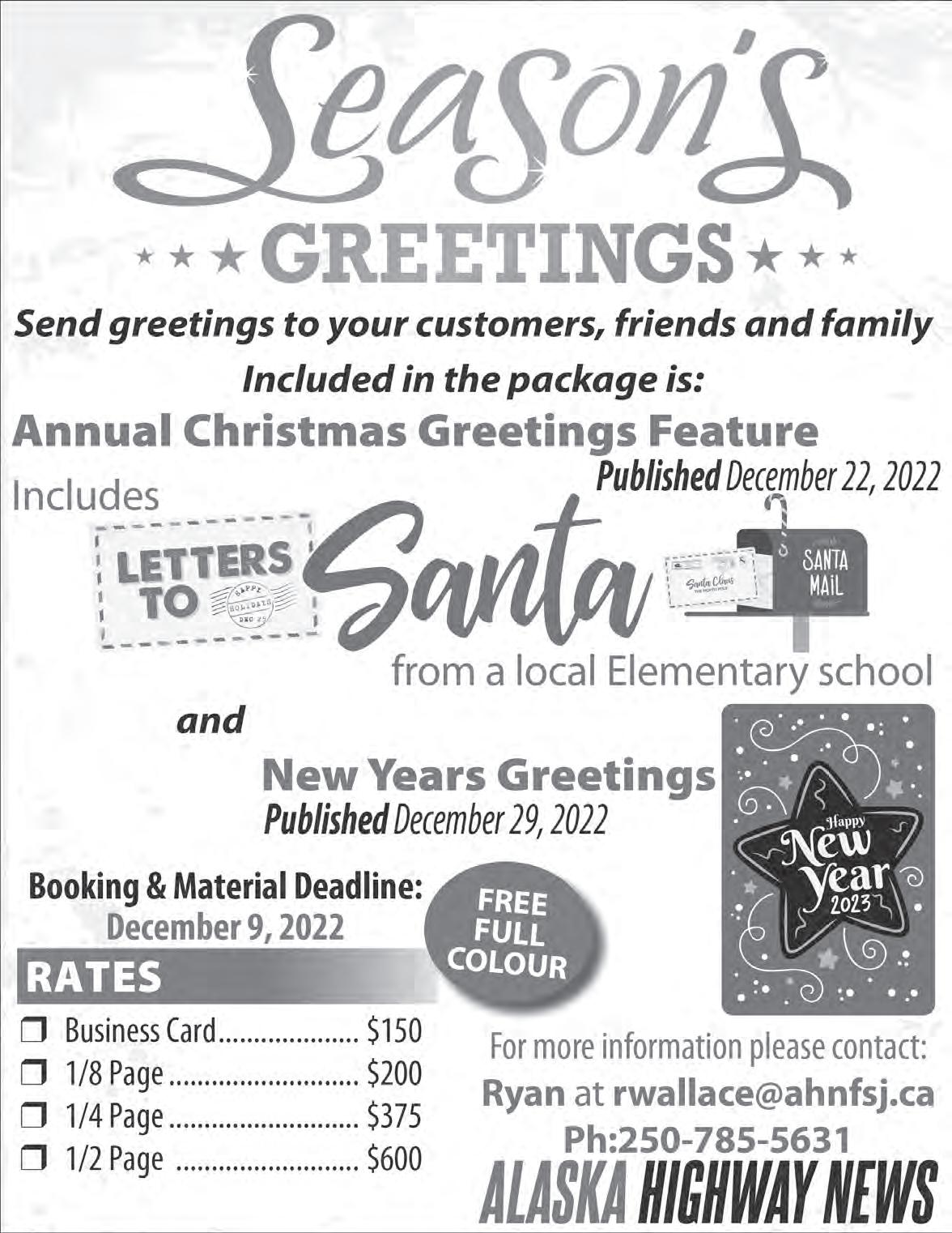 ALASKA HIGHWAY NEWS A2 | NEWS | THURSDAY, DECEMBER 1, 2022 250•785•5631 TO PLACE YOUR AD DIRECTORY BUSINESS COUNTRY PEACE AHN DENTAL SERVICES CASH FOR GOLD & SILVER! Paying Full Price for 999 Silver. Also Buying Coin Collections, Old Paper Money & Jewelry. Todd 250.864.3521 BUY/SELL/TRADE METALROOFING METALSIDING AURORA STEEL &TRIM 1-250-794-6618 jwalter@aurorast.com www.versaframe.ca Delivery to site available with 3-4 day turn around. * 40 year warranty Rollformed to Custom Lengths Manufacturer Direct AGRICULTURAL COMMERCIAL Need an installer? Contact us to get in touch with local installers/builders RESIDENTIAL ROOFING/SIDING MerryChristmas! MiyoKisikanisi!Manitowi Joyeux Noel! Hyvaa Joulua!