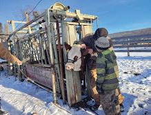 I ended up picking him anyway, he is a dark red curly calf with not much white. Sara picked out a steer that day as well, it was a brown long bodied steer. She also wanted to wait and see one of the calves that was still out on the range at the time, to compare it with the long, brown steer. So she waited until it came in then she compared the two of them, she liked the red steer better. So she too now has a big dark red panda eyed steer. Picking out our 4-H heifers went great, Sara has picked her heifer off her own cow, like she has done for the last 3 years in a row. I sold one of my cows and decided to give Mom and Dad the money I got from it, in trade for one of their heifers and guess what that is my new 4-H heifer.
