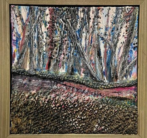 Above left: Tea for Two, mixed media on wood by Julene Gunther Above right: Whispers in the Wood, encaustic mixed media by Suzon Anne Tremblay Below left: The Peace of Other Times & Other, carved yellow cedar by Ken Forest