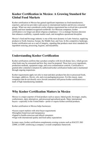 Kosher certification in Mexico has gained significant importance as food manufacturers, exporters, and service providers seek access to international markets and diverse consumer groups. What was once considered a niche religious requirement has evolved into a powerful quality and trust standard recognized worldwide. For Mexican companies, kosher certification is no longer just about religious compliance—it is a strategic business decision that enhances credibility, expands market reach, and strengthens operational discipline.
