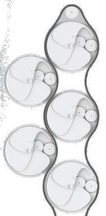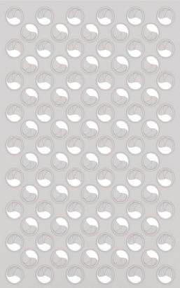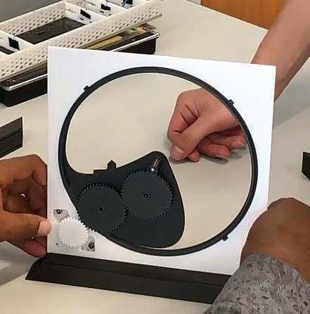 The pattern is made of a circular frame, which is enclosed by one static blade and three rotative blades rotating in the rail that is engraved in the frame and will be driven by the gears. While the blades themselves are visible, the gear system that drives their movement remains hidden from view.