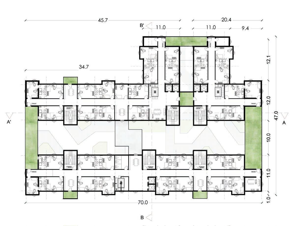 When it comes to the building the structure is inspired by green and sustainable design philosophy, On the deign there is green belt on each section and additional 4 devoted green space, In advance to control the building thermal comfort and also to maximize work productivity there is polycarbonate glazing as roof for maximum light penetration and mechanical solar multi-seed shade panel to control and maintain thermal and light penetration as needed.