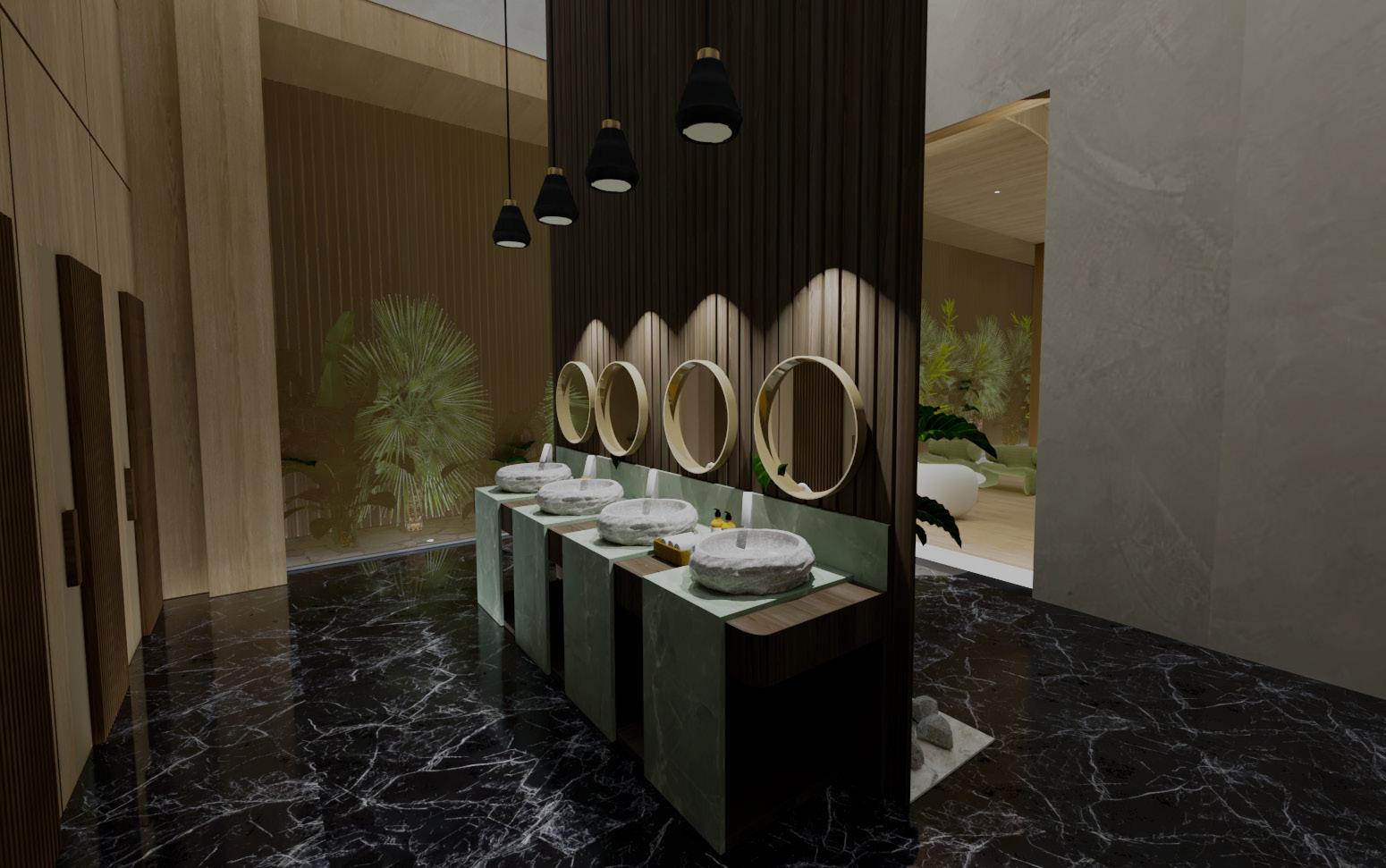 The restrooms for the users feature Black Marquina marble flooring, complemented by wood battens for decorative purposes in the wall cladding at the restroom entrance. The right-hand side offers views of the interior garden, enhancing the sense of spatial connection between the interior and the outdoor environment.