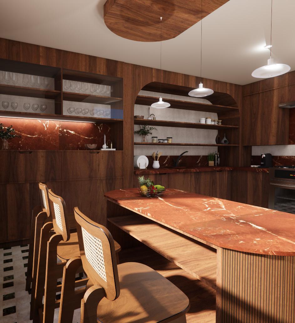 This project focuses on the design of a functional yet aesthetically refined kitchen, drawing inspiration from the Mid-Century style. The space is thoughtfully curated to balance practicality and elegance, integrating organic forms, natural materials, and a warm, earthy palette. The design prioritizes efficient spatial flow, ensuring a seamless user experience while maintaining a visually striking composition.