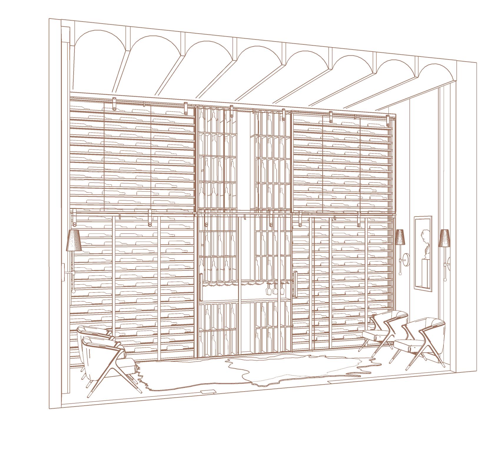 The Cava & Wine Tasting space features a white stucco wall finish complemented by Romage Greige marble slabs, where niches with a walnut wood backdrop have been designed. The ceiling showcases a vaulted design made of pine wood. The space includes a custom-designed wine cellar for proper bottle storage, an integrated glass rack for stemware organization, and a ventilation system to ensure optimal wine preservation and storage.