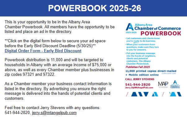 This is your opportunity to be in the Albany Area Chamber Powerbook. All members will be listed and can place a display ad in the directory.