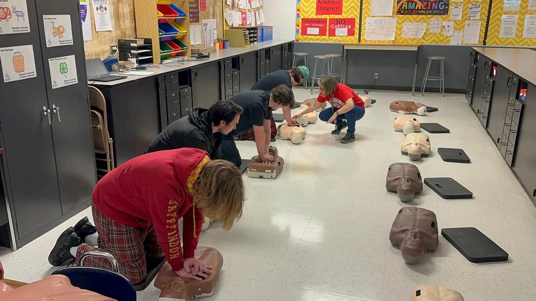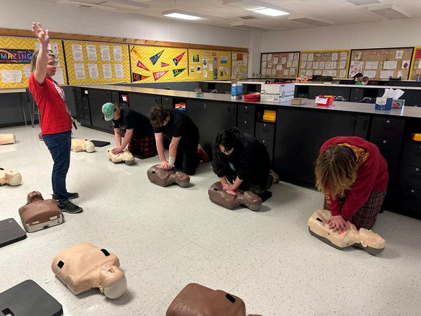 Students at SAHS learn how to do CPR on mannequins in health class.